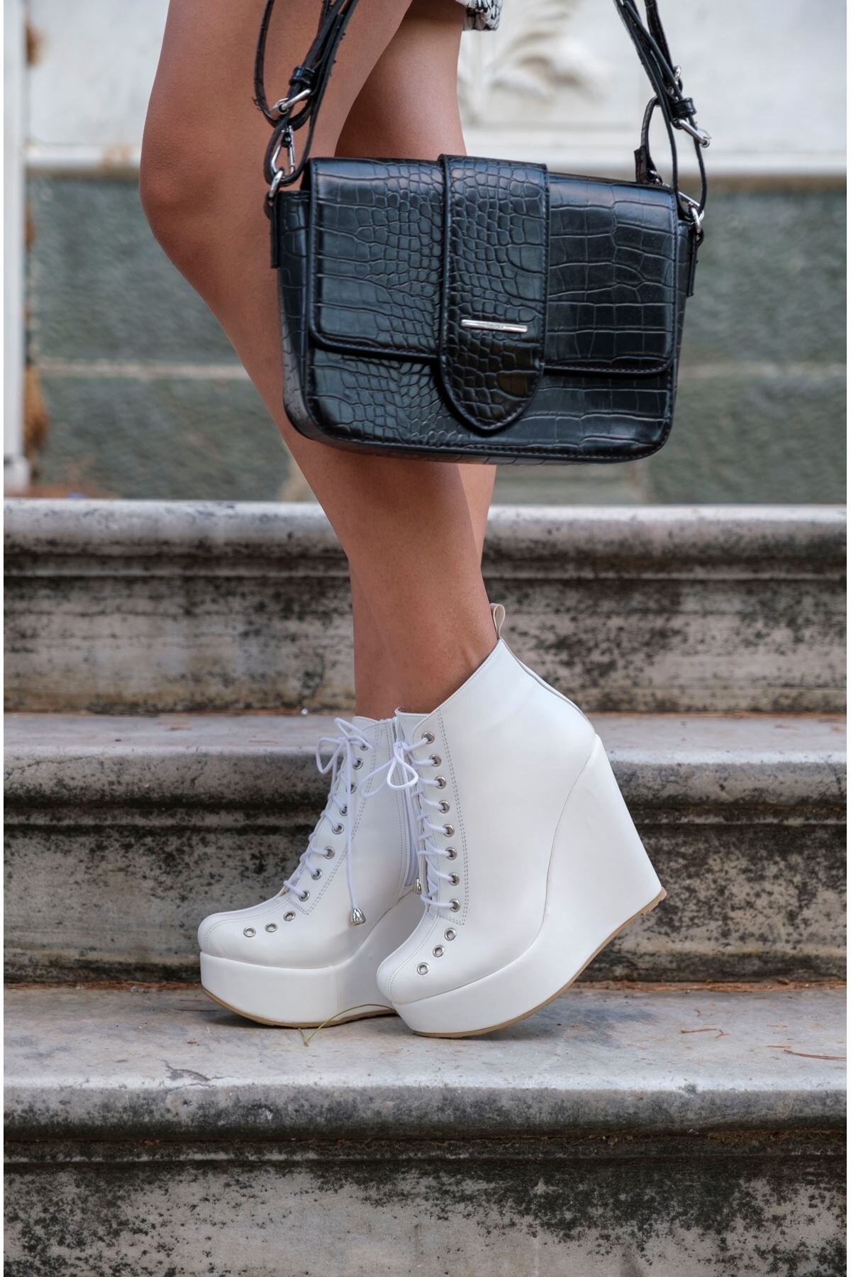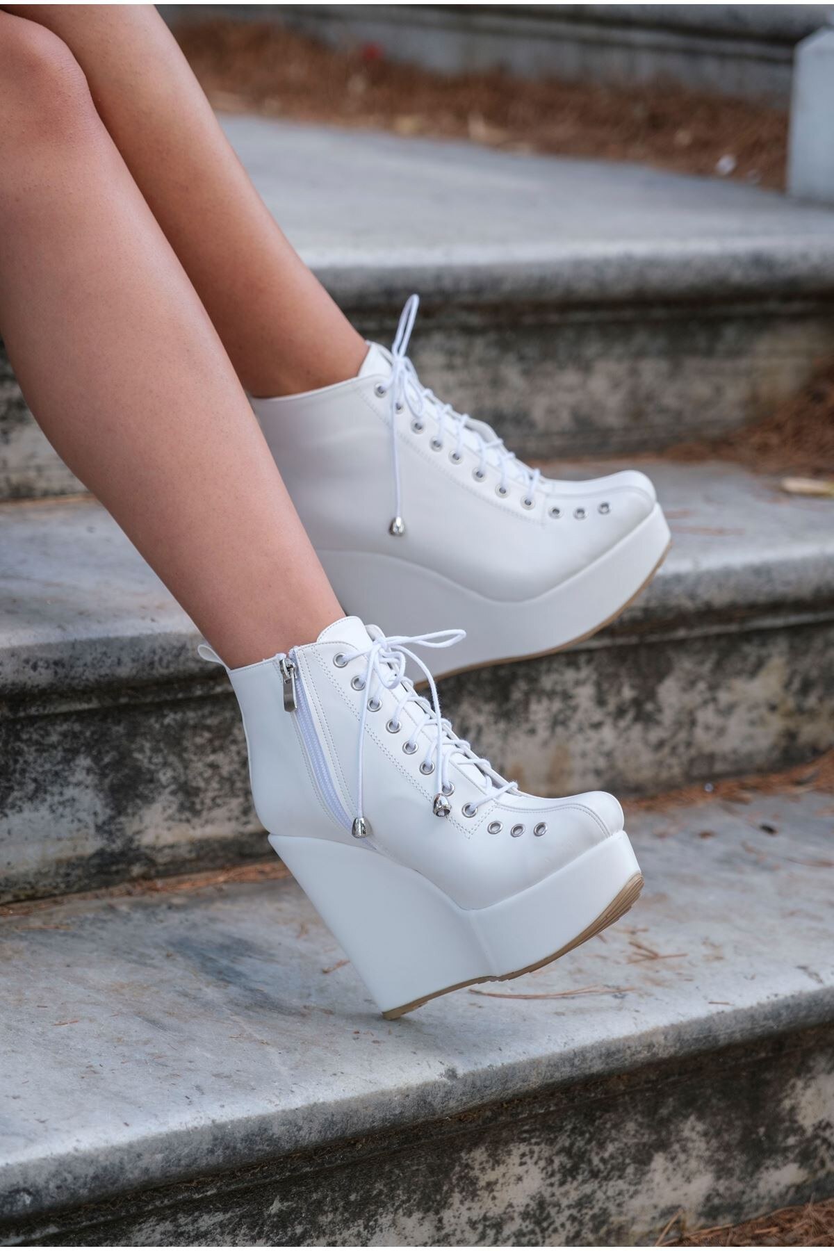 Kadın Dolgu Topuk Bağcıklı Bot Lindy Beyaz Cilt