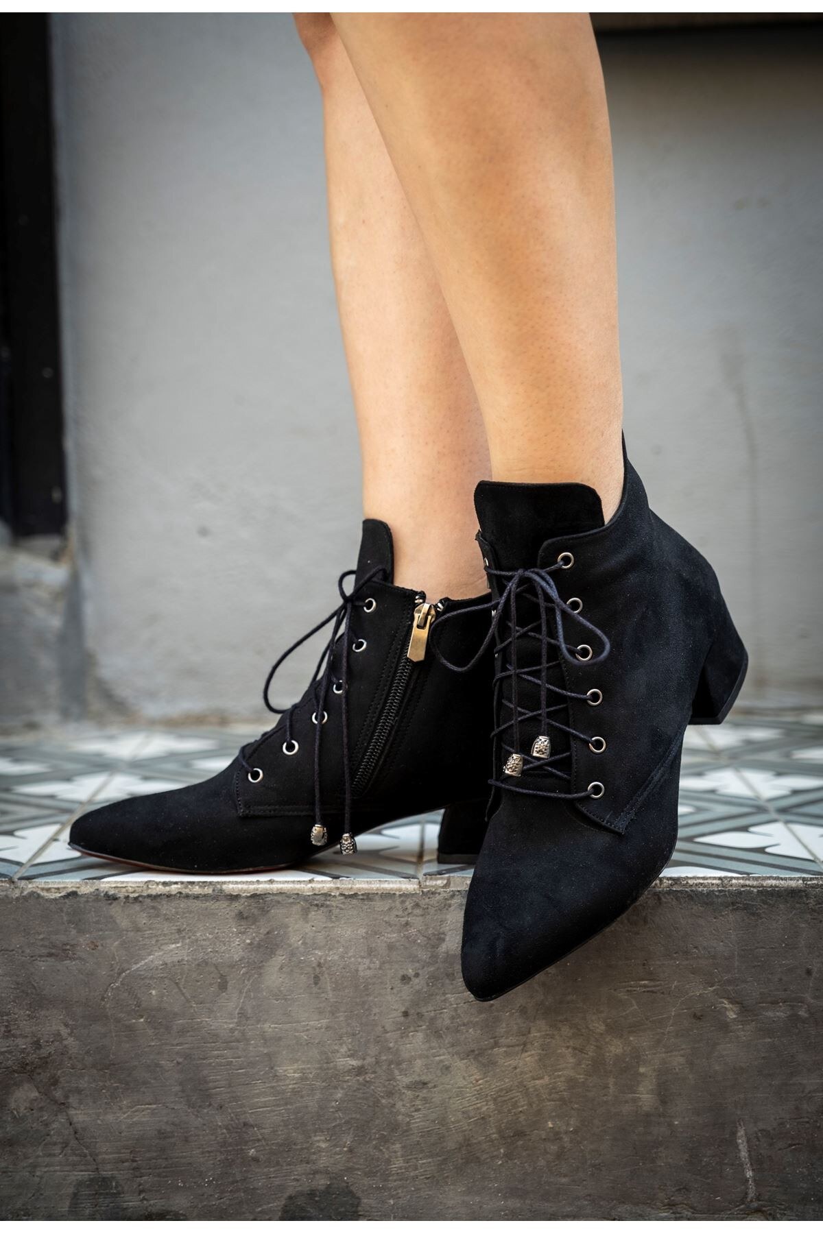 Kadın Kısa Topuklu Bağcıklı Bot Marea Siyah Süet