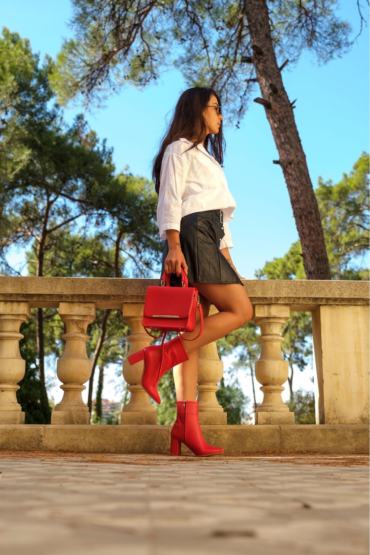 Kadın Kısa Topuklu Sivri Bot Kona Kırmızı Cilt