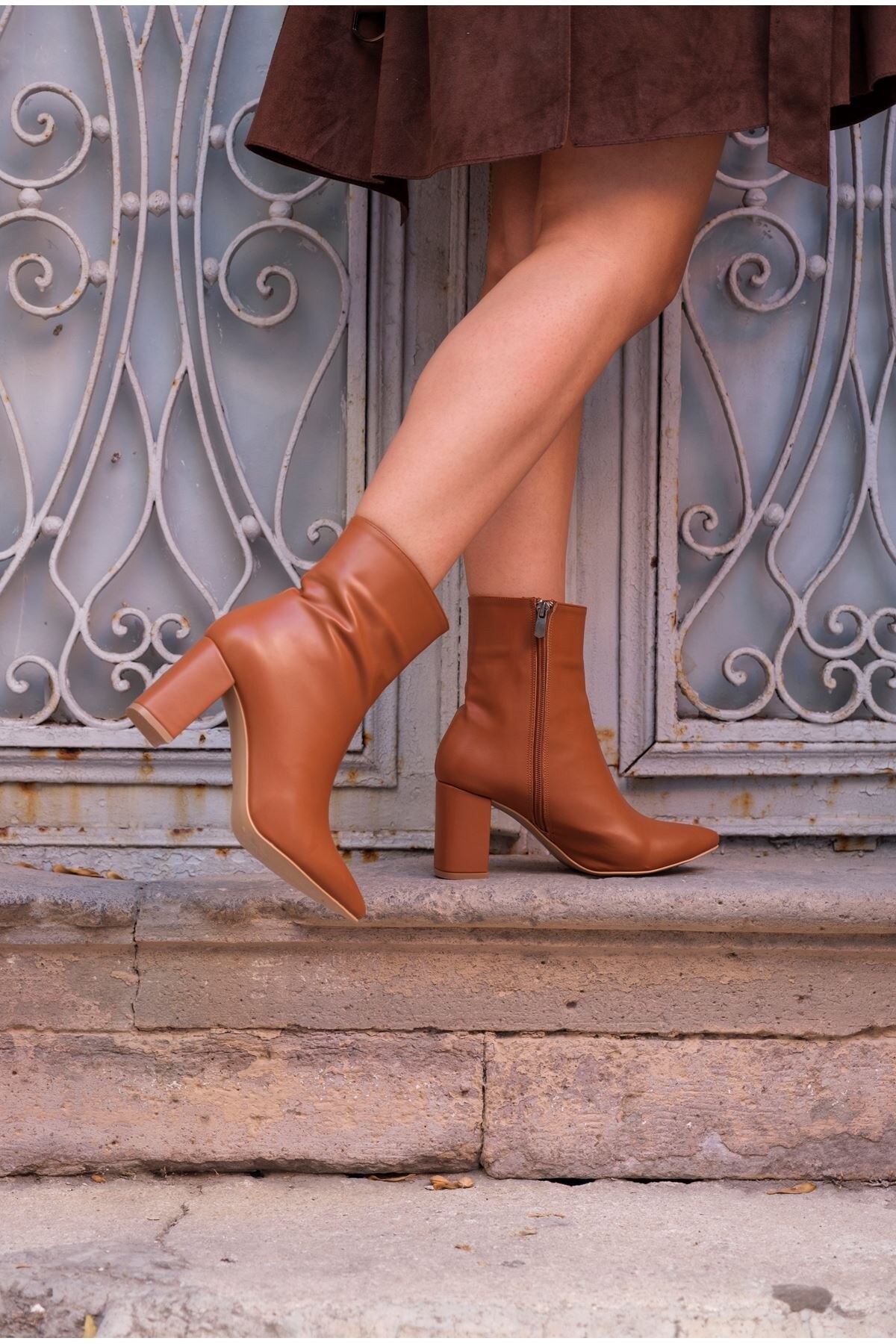 Kadın Kısa Topuklu Sivri Bot Kona Taba Cilt