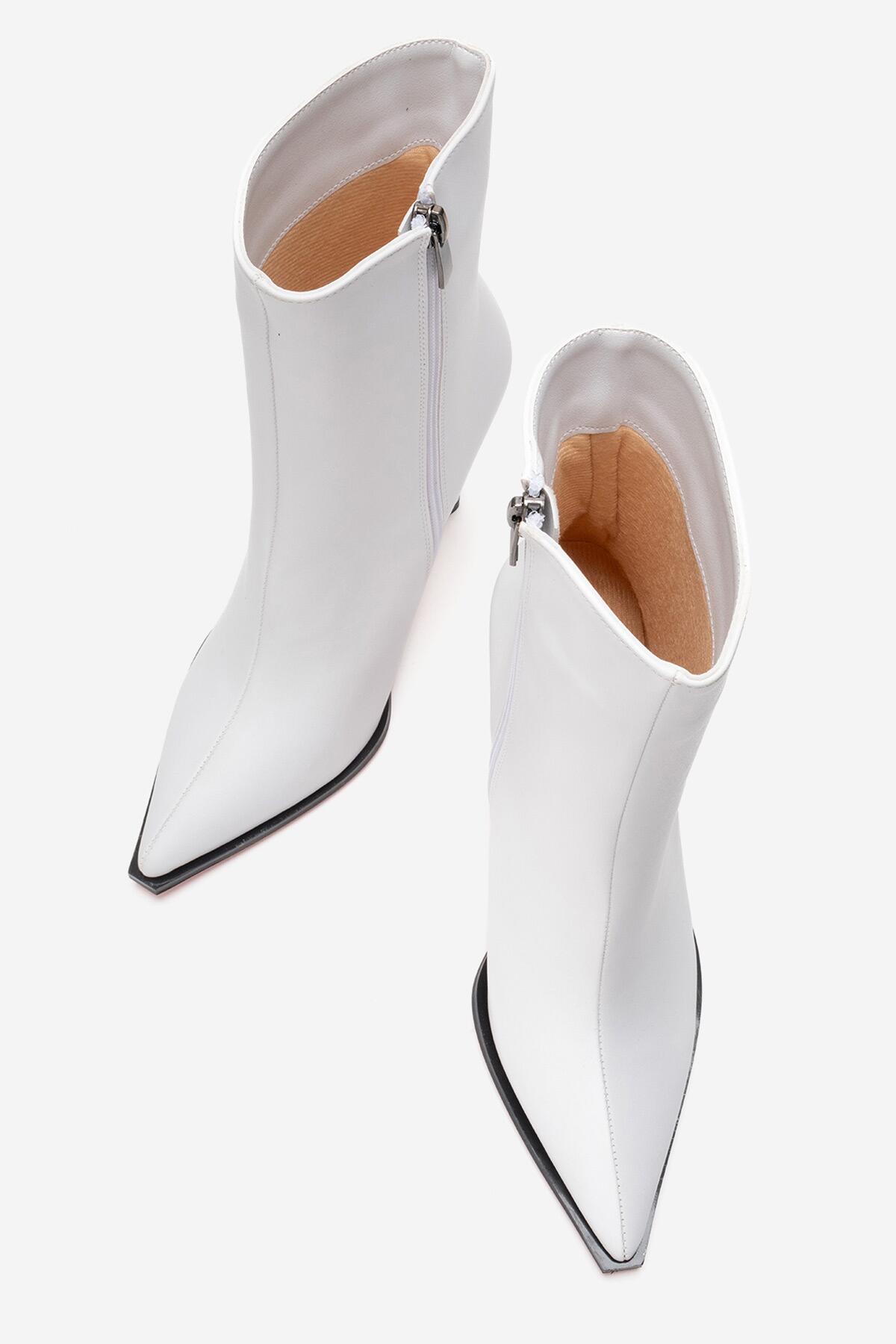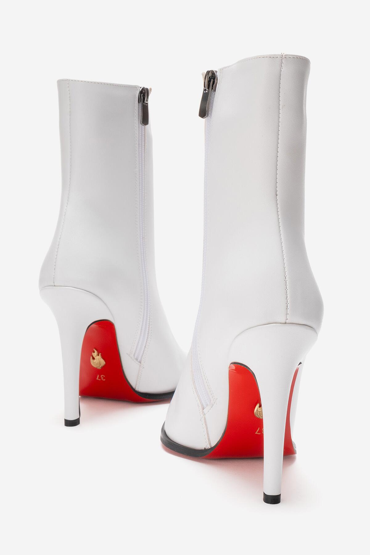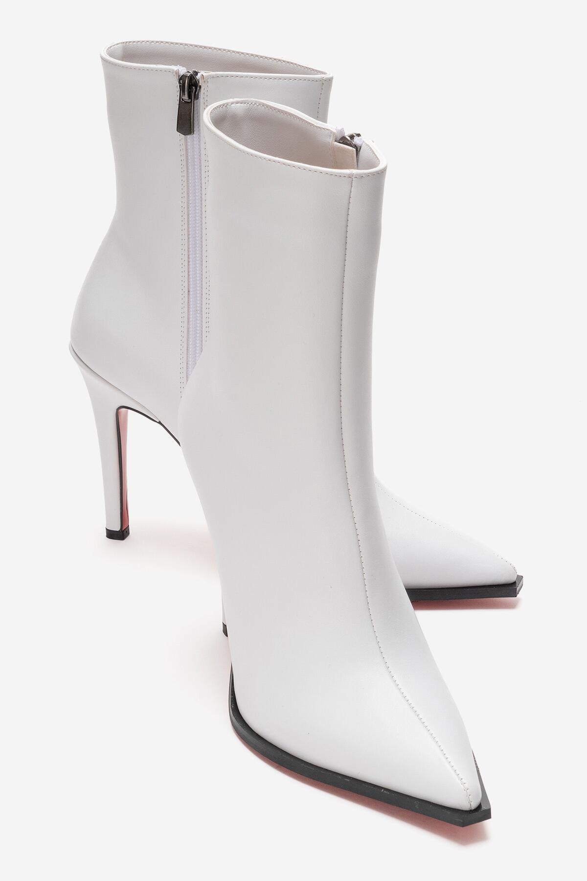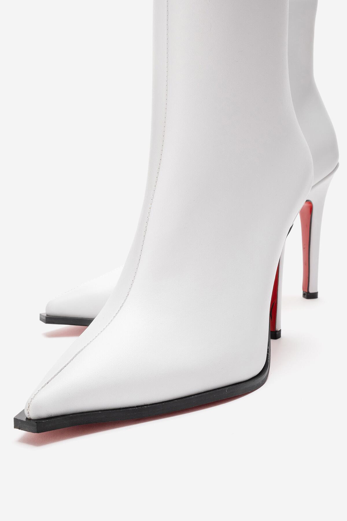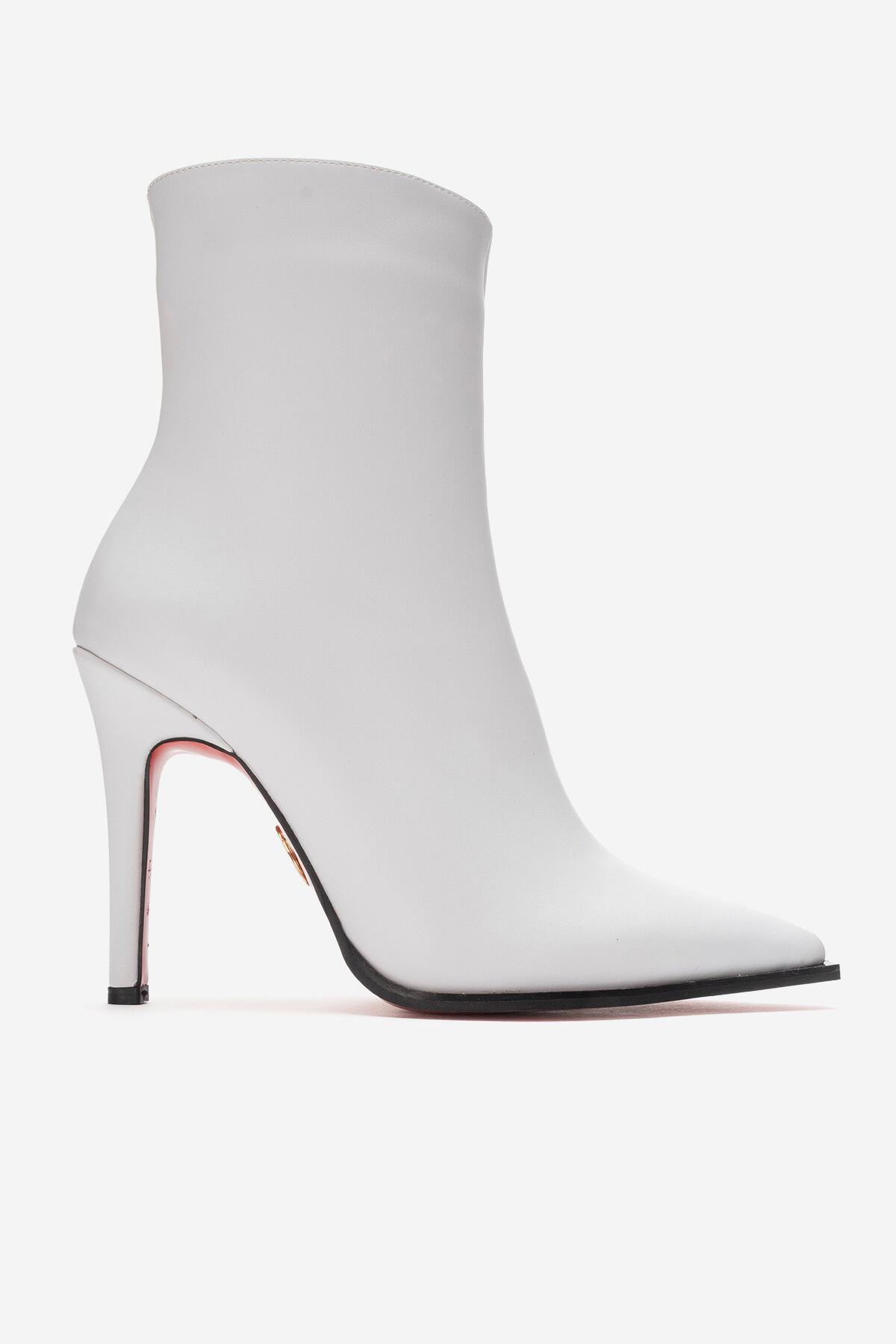 Kadın Tasarım Taban Bilek Boy İnce Topuklu Bot Yanni Beyaz Cilt
