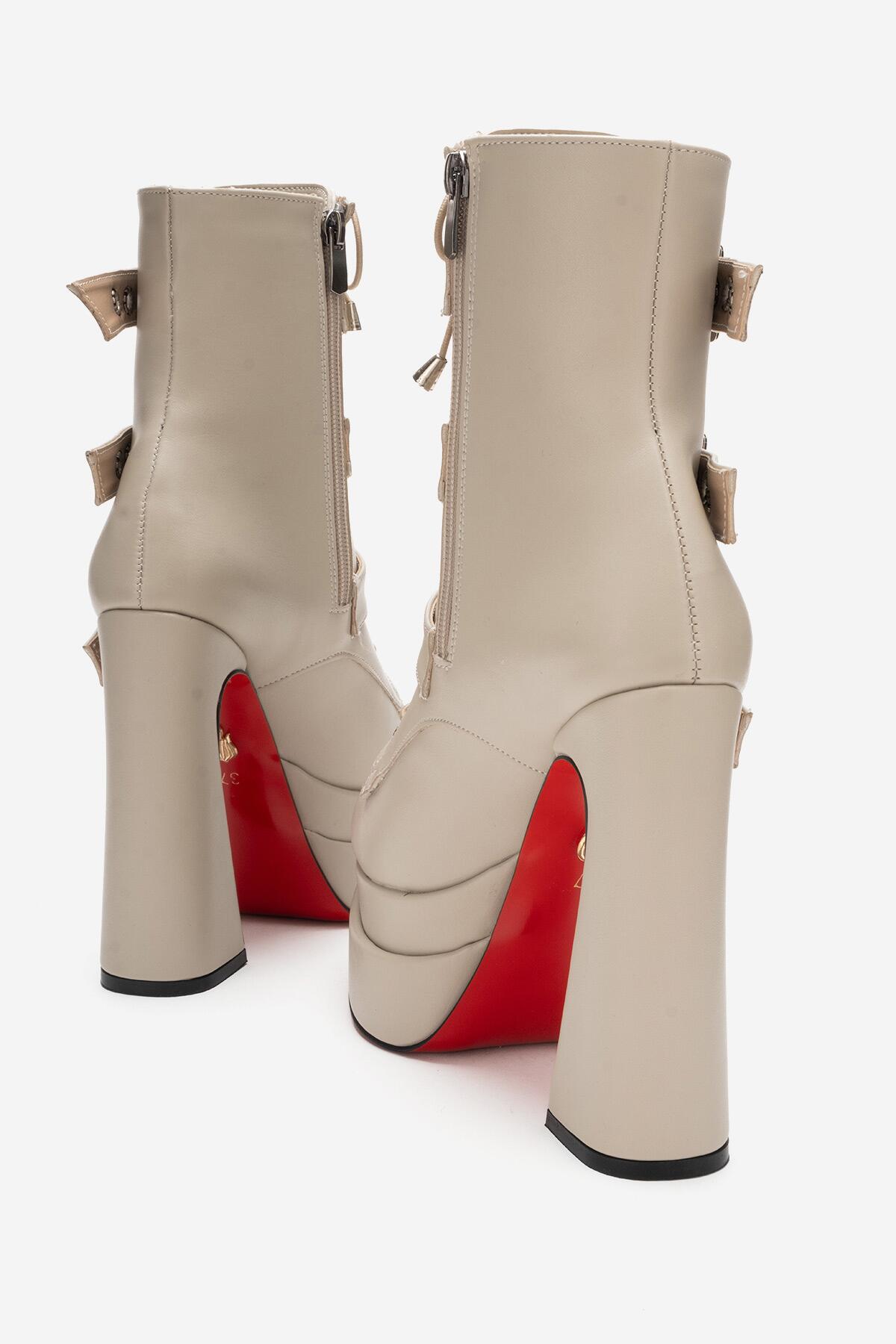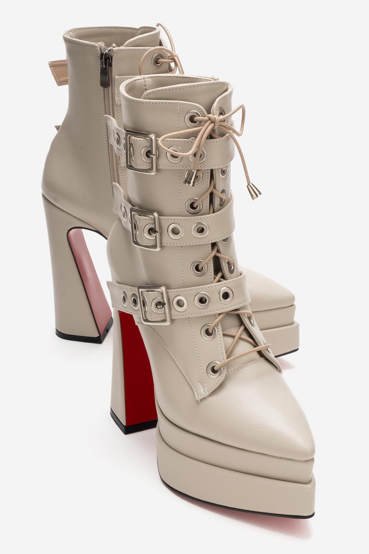 Kadın Üç Tokalı Sivri Burun Yüksek Topuklu Fermuarlı Bot Rugani Bej