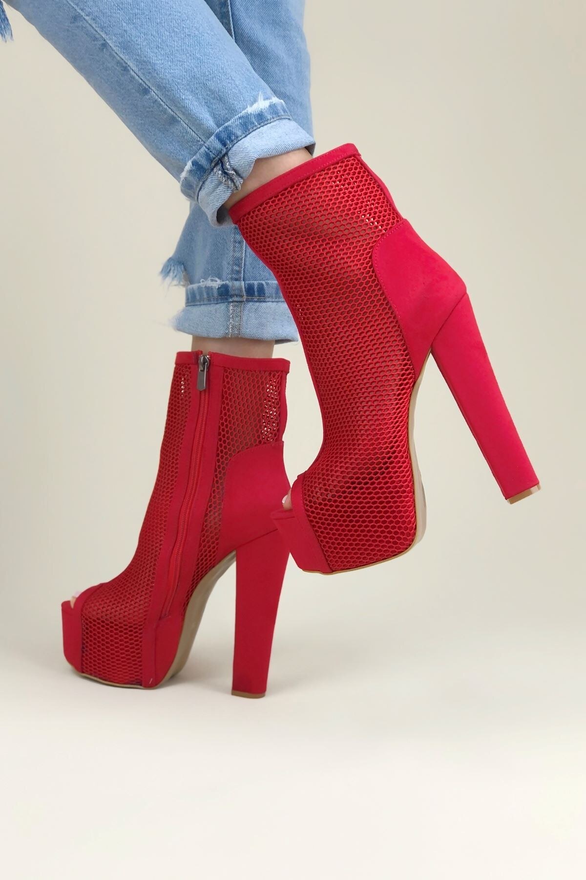 Kadın Yüksek Topuk Fileli Yazlık Bot Yoko Kırmızı Süet