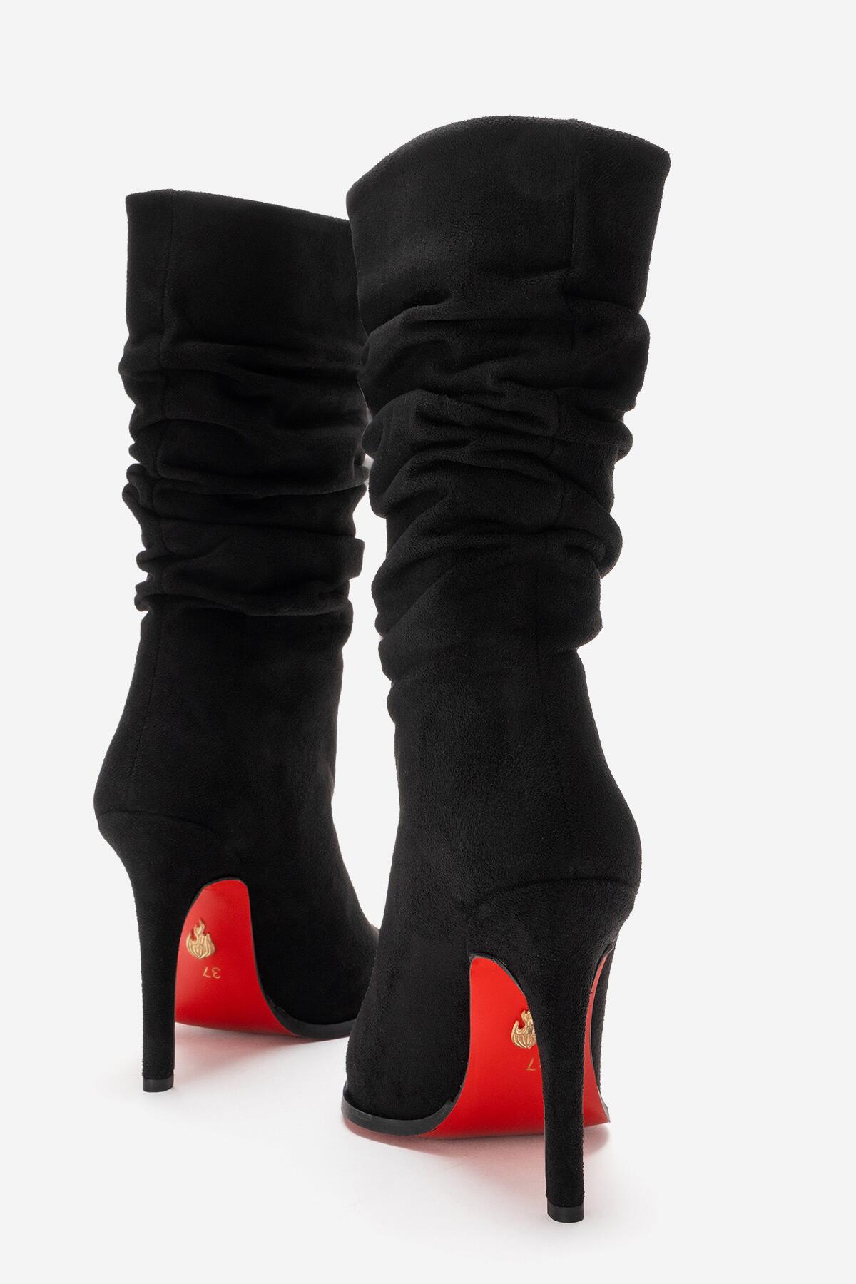 Büzgülü Kadın Bot Sivri Burun İnce Topuklu Körüklü Şık Çizme Stane Siyah Süet