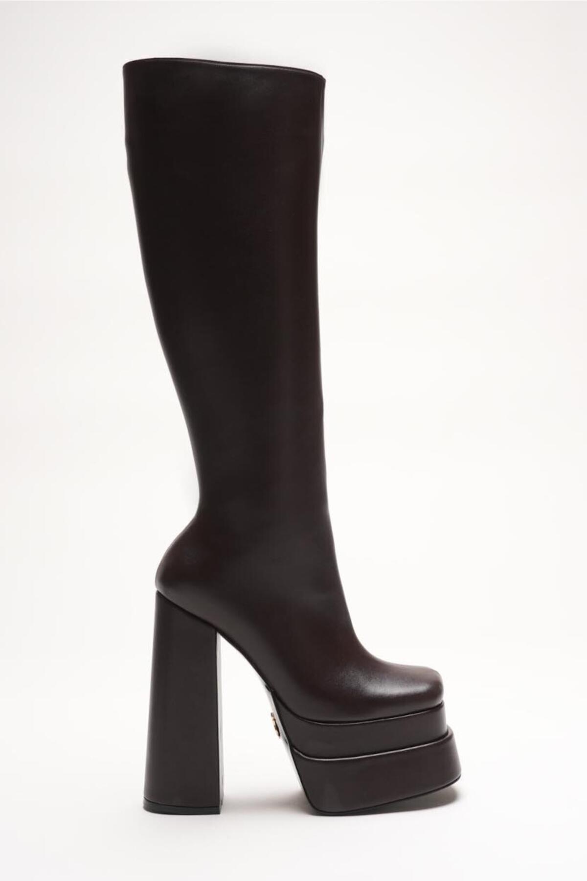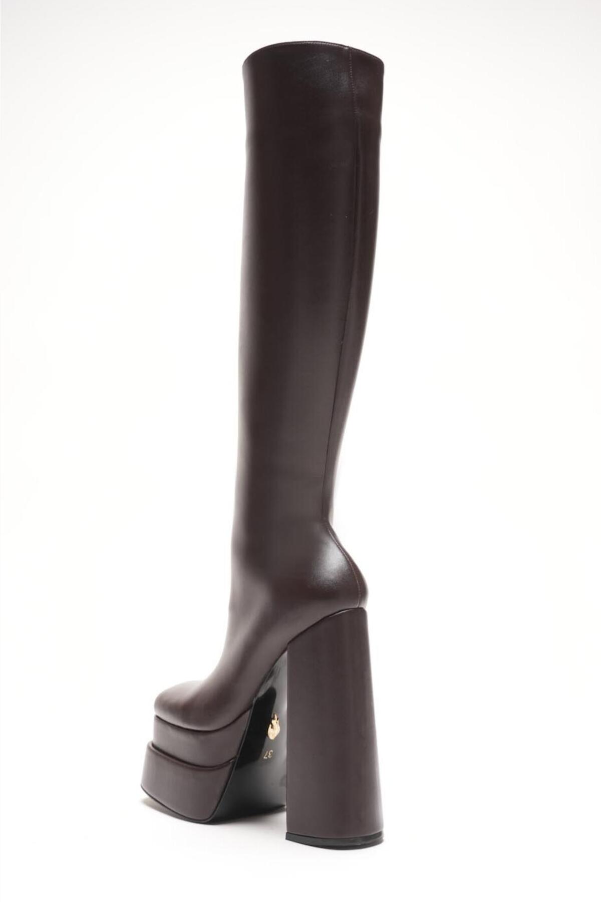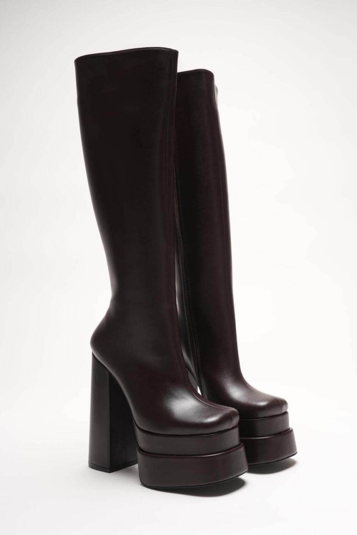 Kadın Çift Platform Kalın Topuk Çizme Penny Kahverengi Cilt