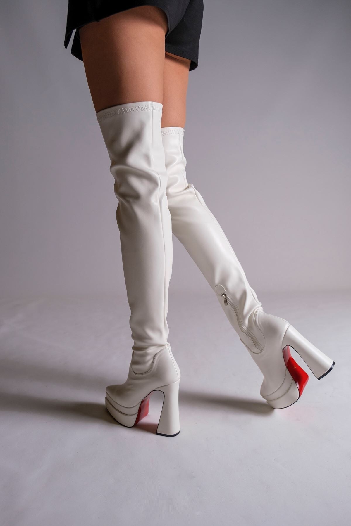 Kadın Çift Platform Yüksek Topuklu Diz Üstü Çizme Brewery Beyaz Cilt