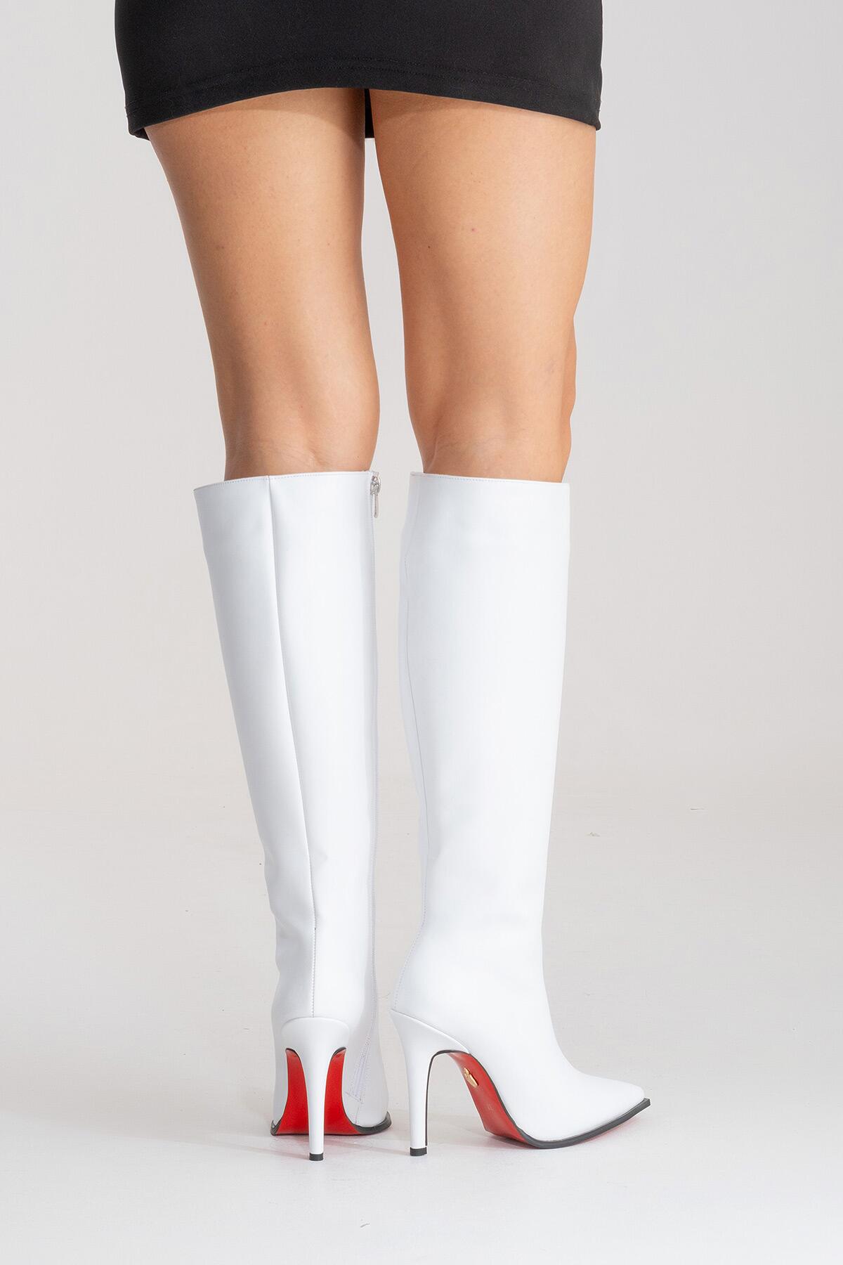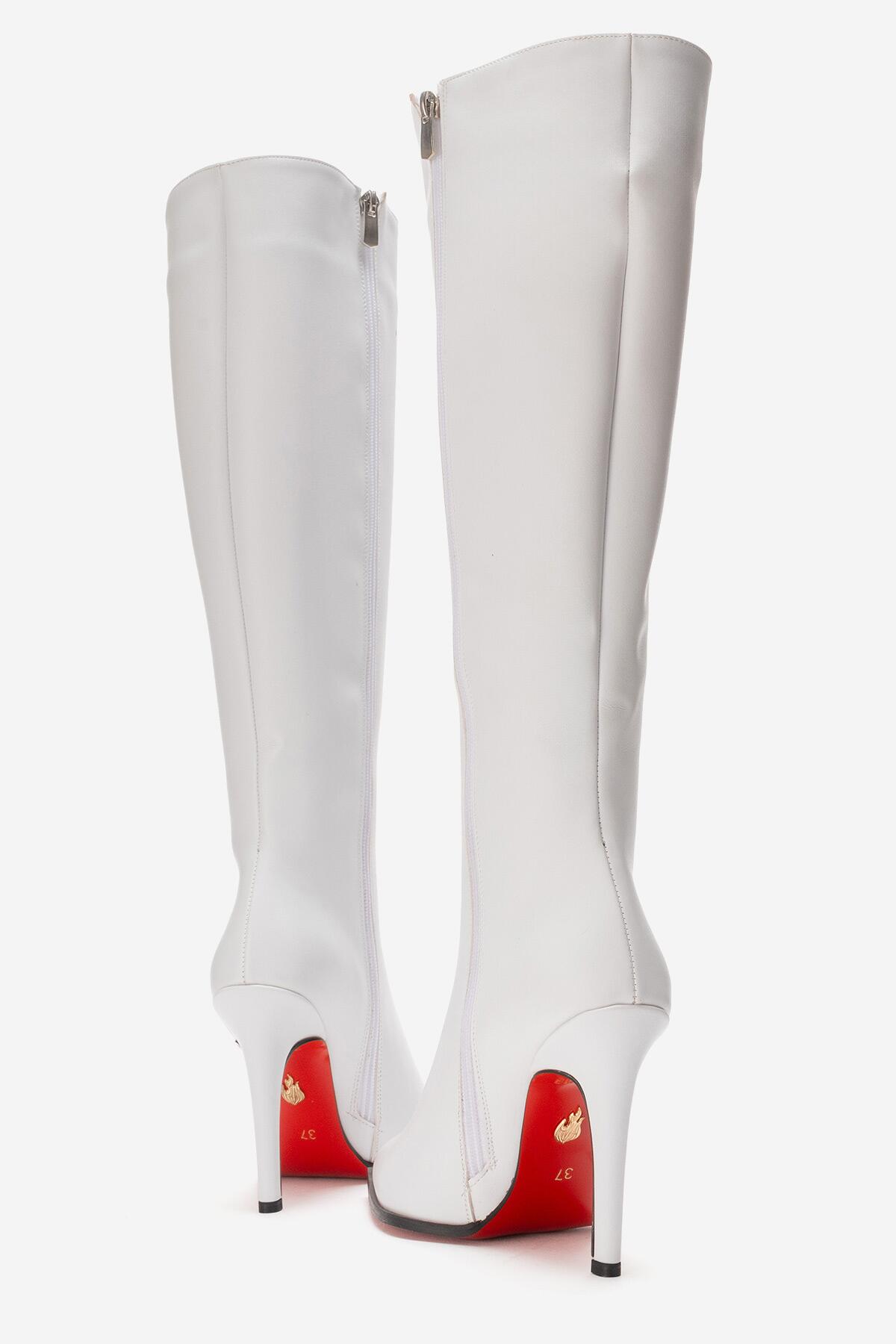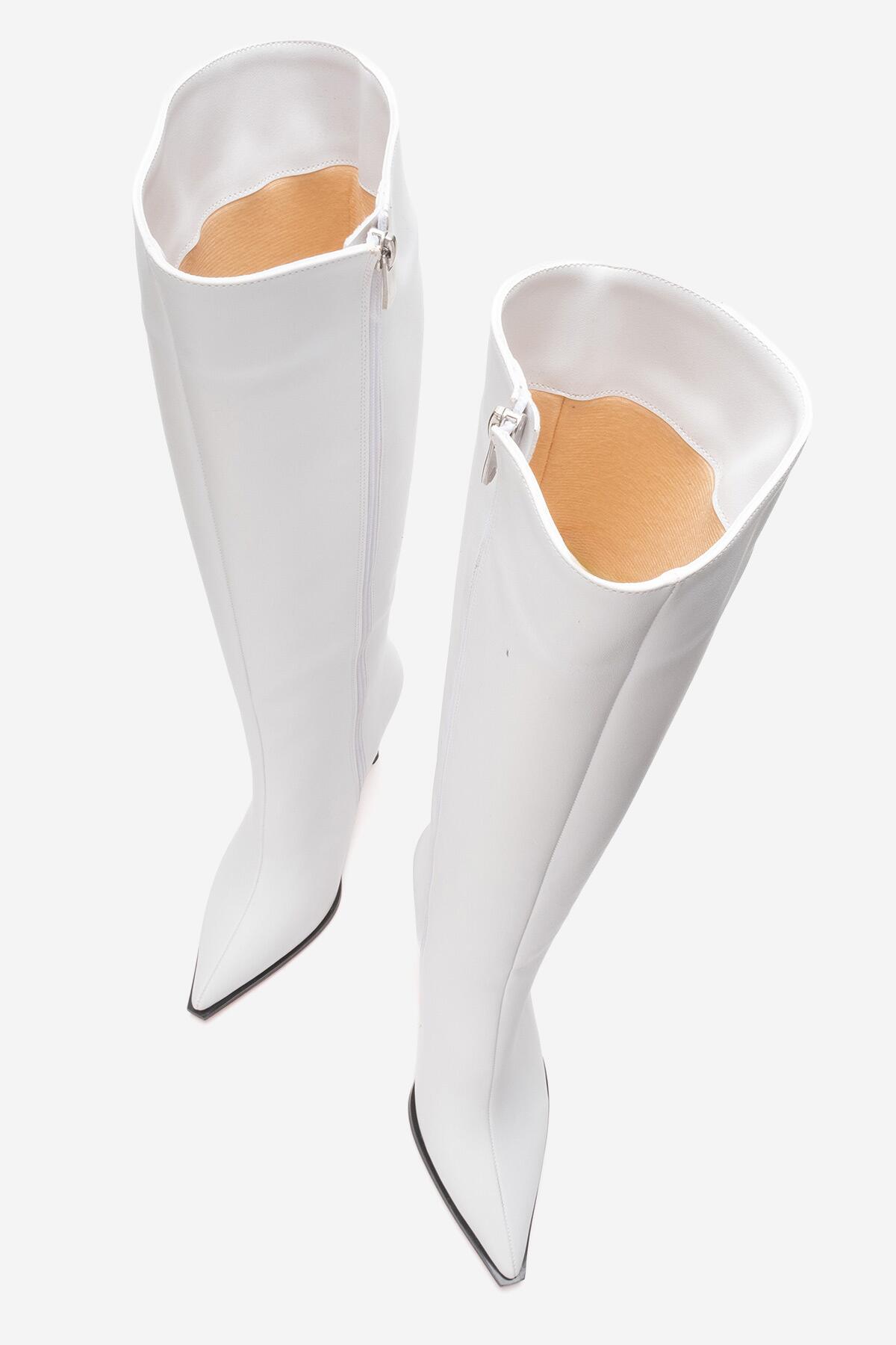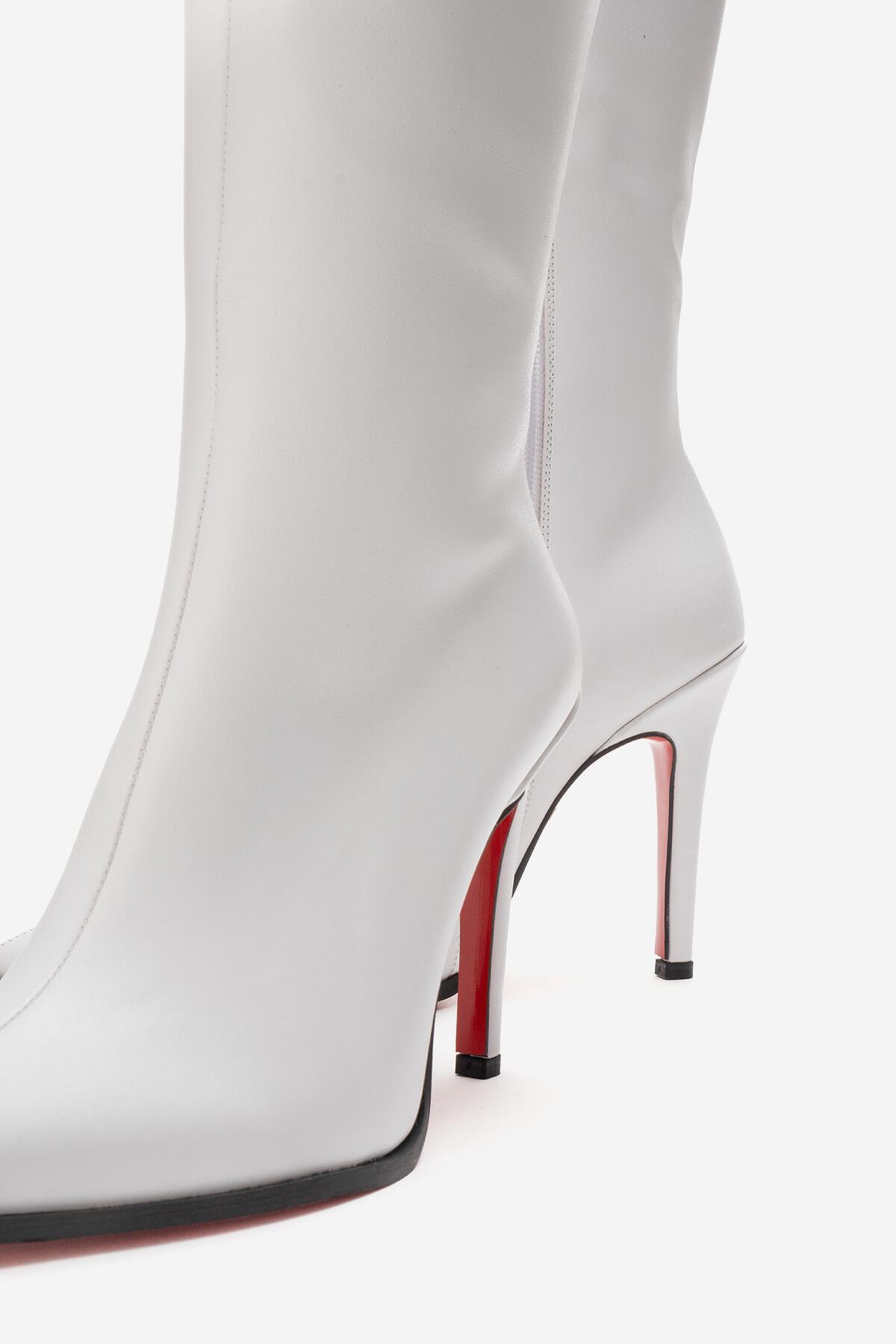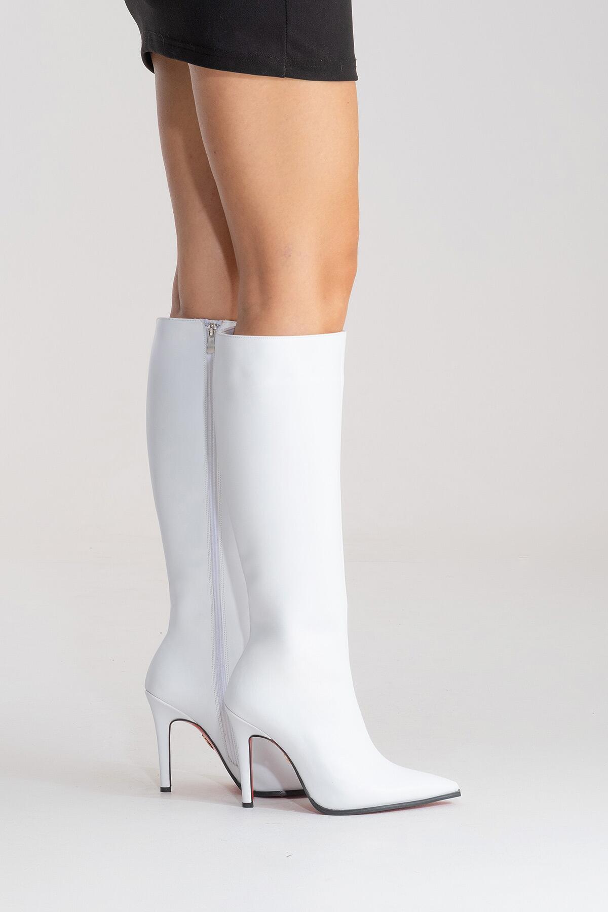 Kadın Diz Altı Fermuarlı İnce Topuklu Çizme Yoran Beyaz Cilt