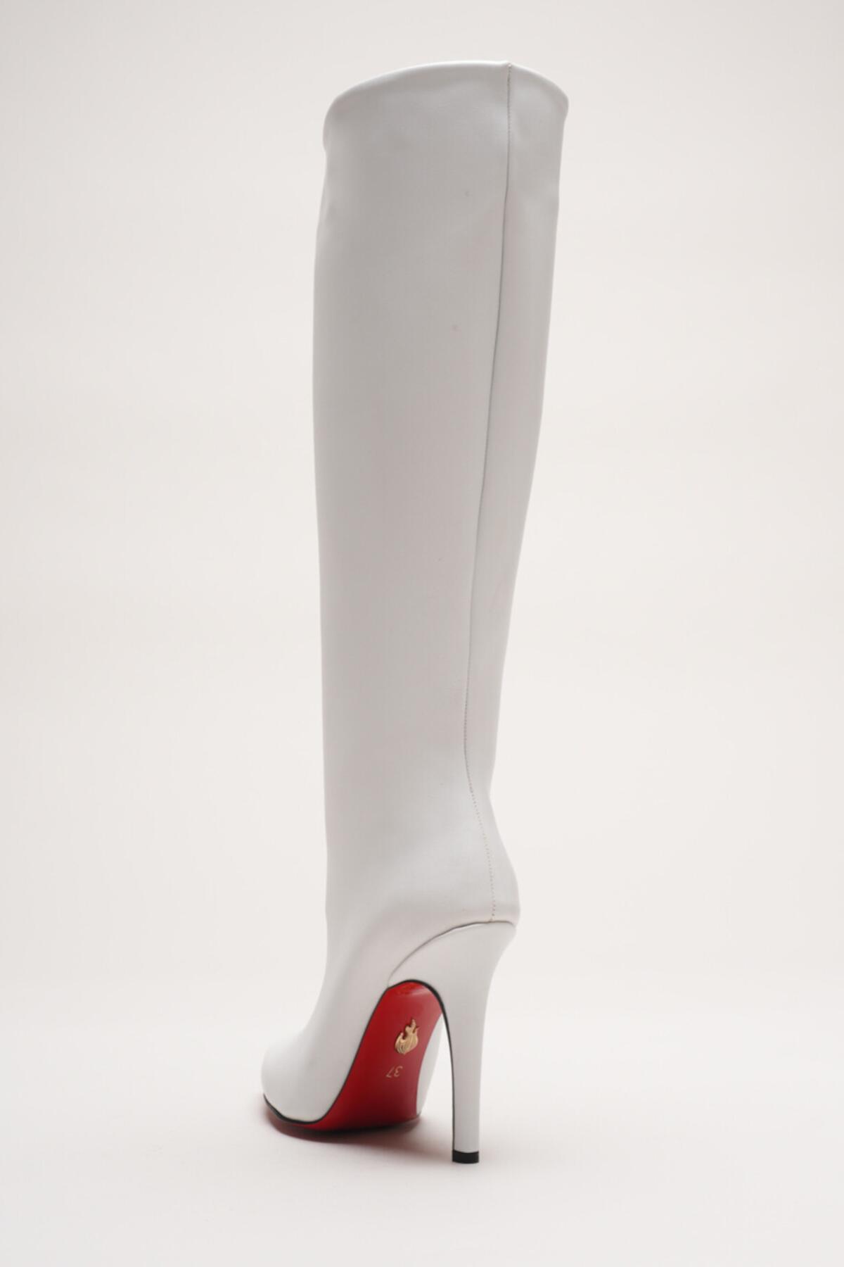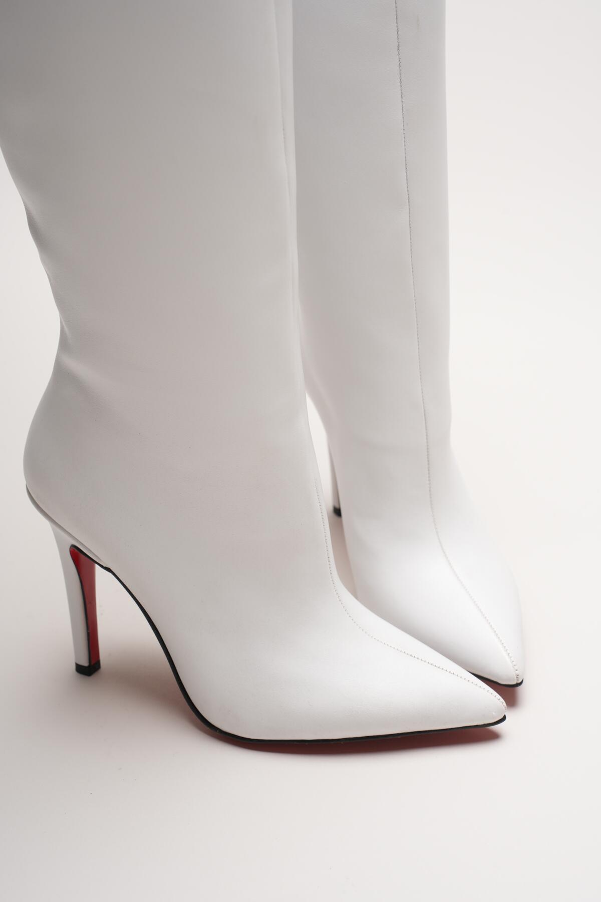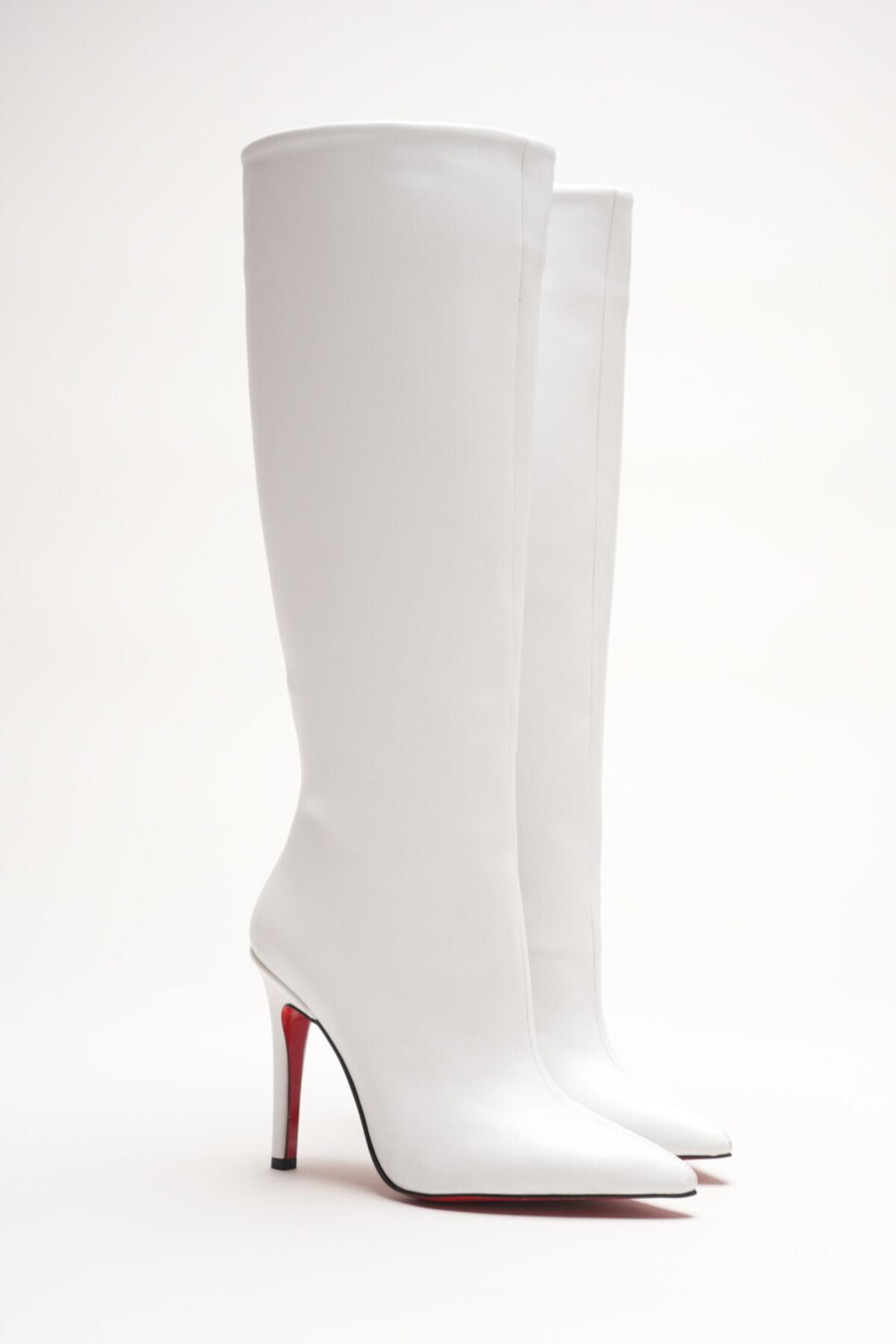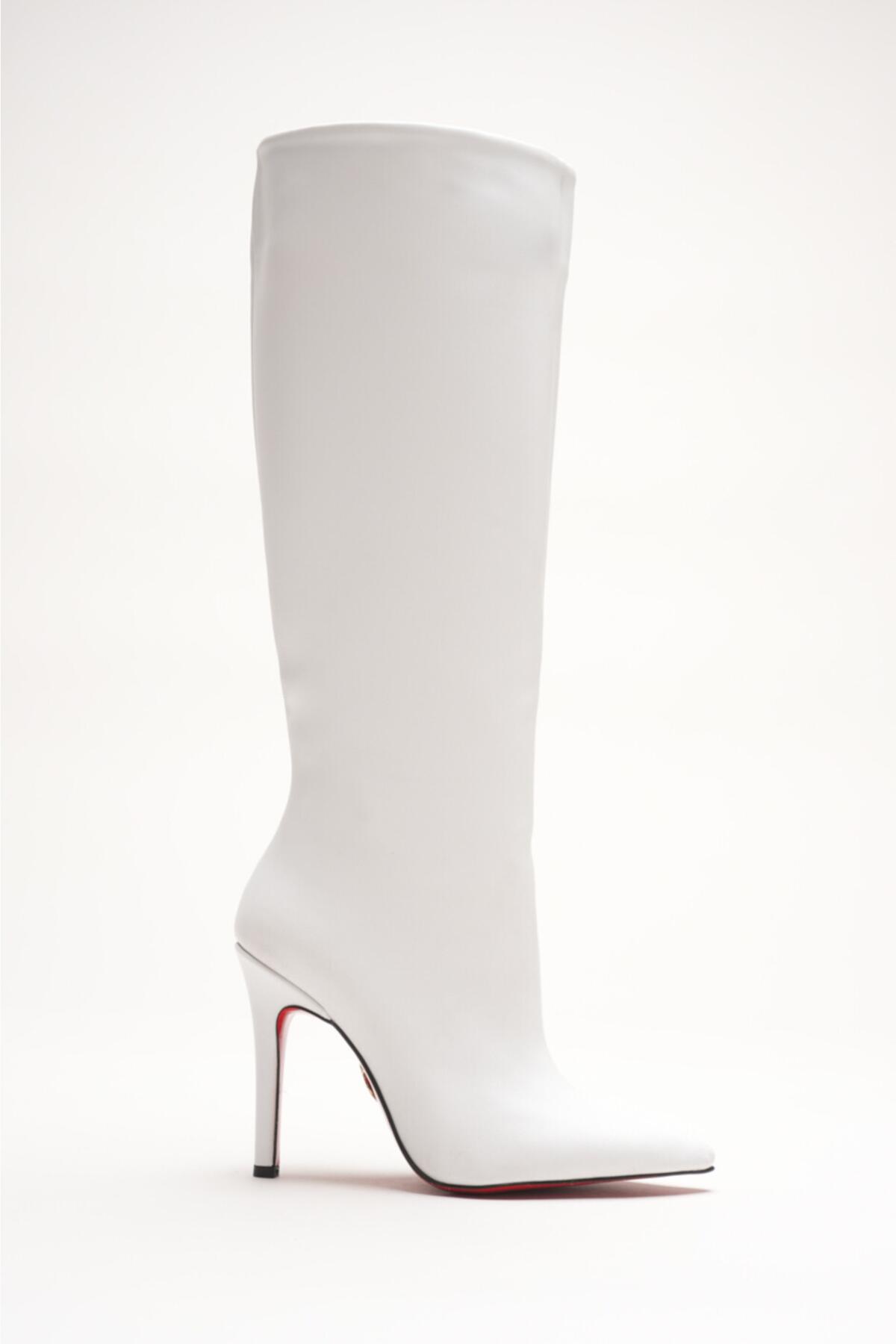 Kadın Sivri Burun Fermuarsız İnce Topuklu Diz Altı Çizme Monias Beyaz Cilt