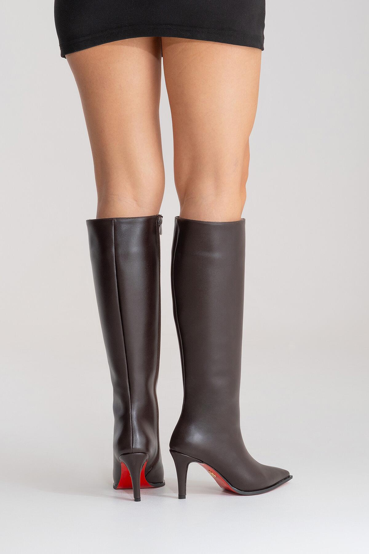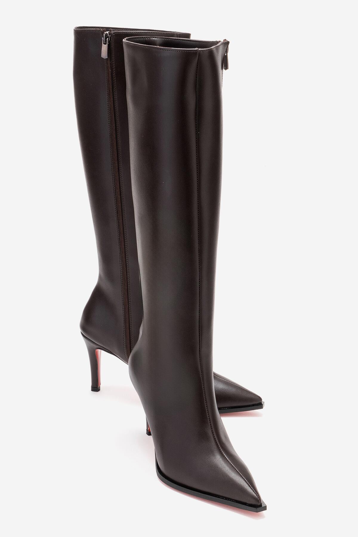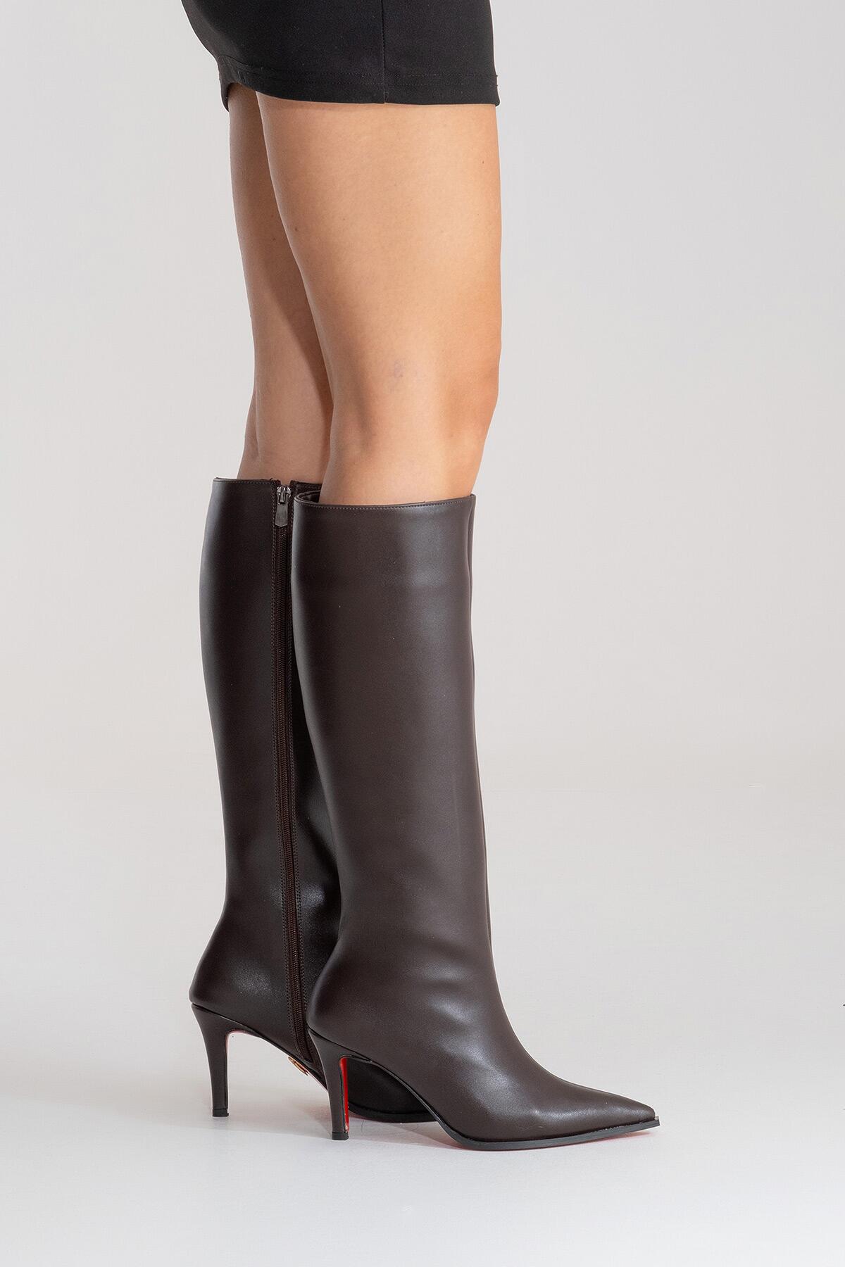 Kadın Sivri Burun Kısa Topuklu Diz Altı Çizme Togie Kahverengi Cilt