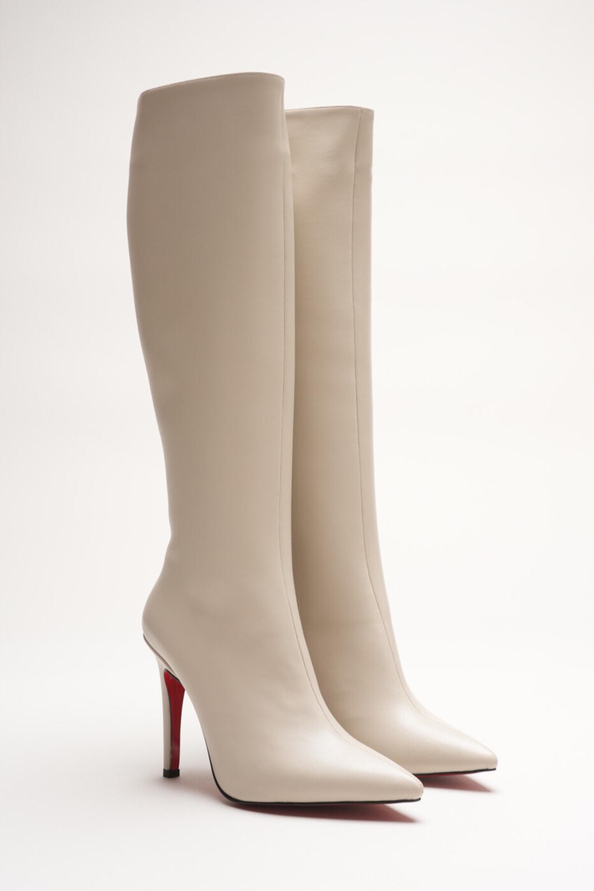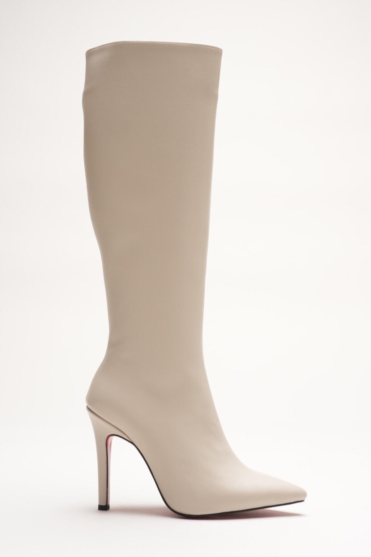 Kadın Sivri Burun Yüksek Topuklu Diz Altı Çizme Limbo Bej