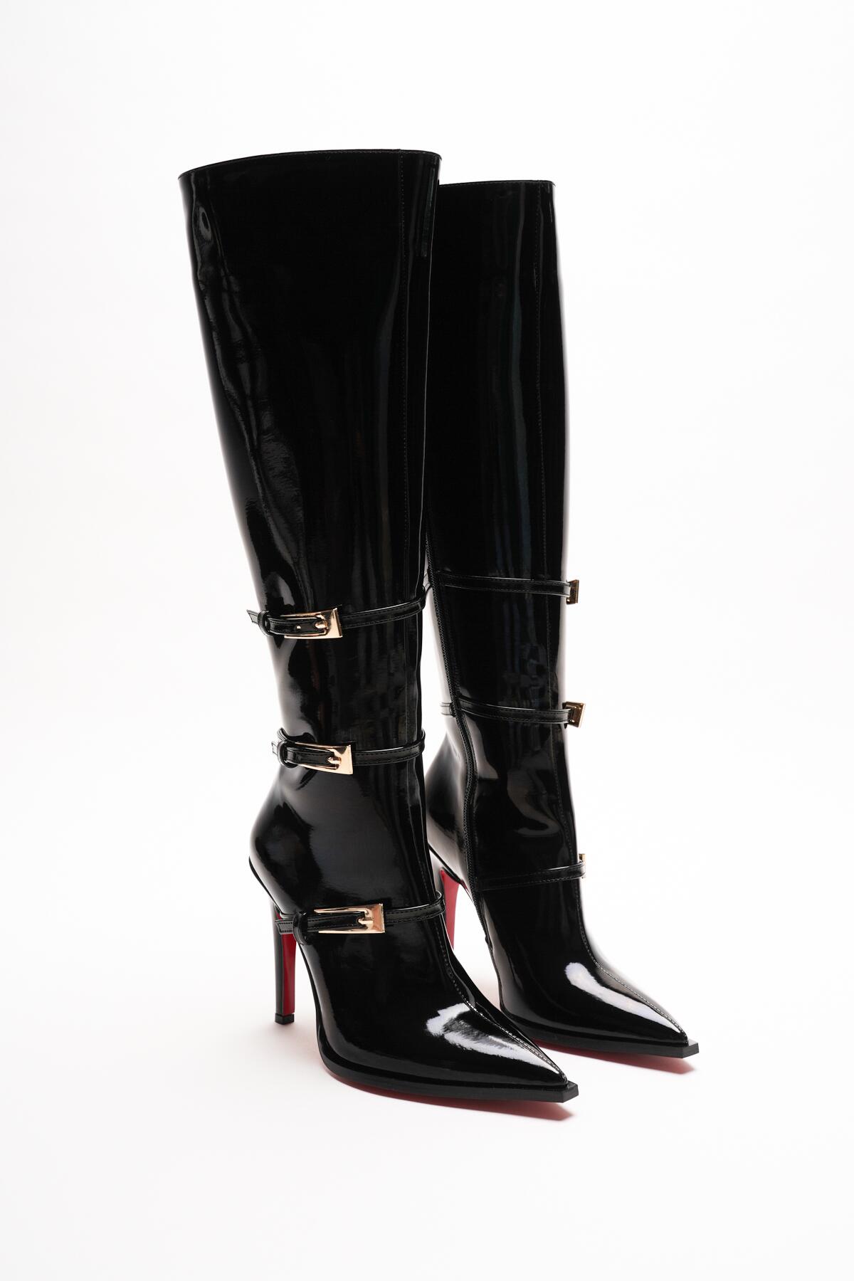 Kombinlerinize cesur bir dokunuş yapmaya hazır mısınız? Siyah rugan derinin parlak asaletini, ikonik kırmızı taban detayıyla buluşturan bu özel tasarım çizme, stil sahibi kadınlar için üretildi.