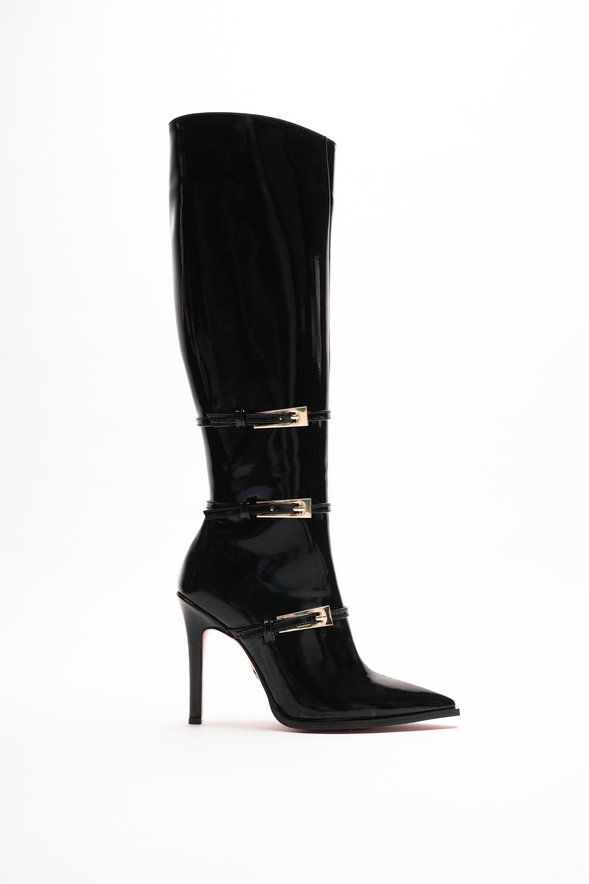 Kadın Siyah Rugan Sivri Burun 3 Tokalı İnce Topuklu Çizme Tokai Siyah Rugan