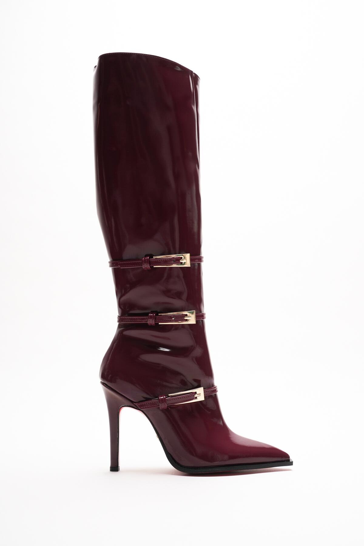 Kombinlerinize cesur bir dokunuş yapmaya hazır mısınız? Bordo rugan derinin parlak asaletini, ikonik kırmızı taban detayıyla buluşturan bu özel tasarım çizme, stil sahibi kadınlar için üretildi.