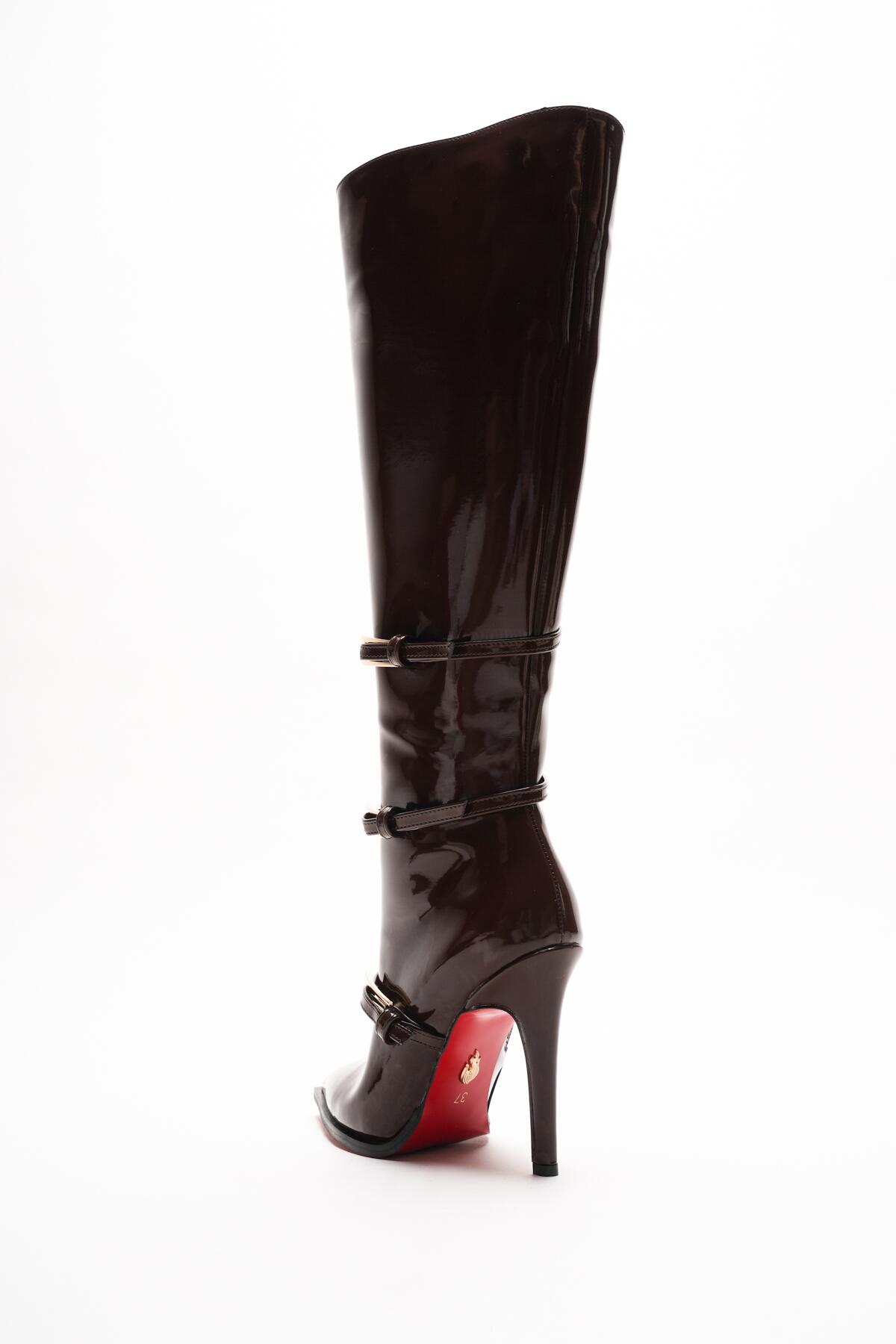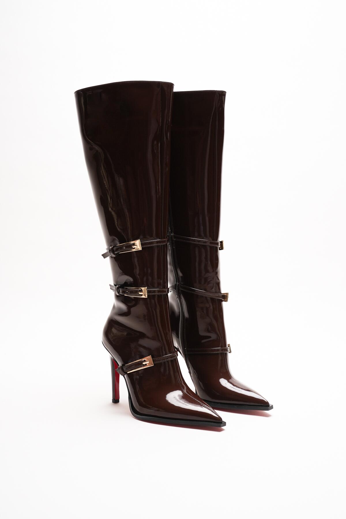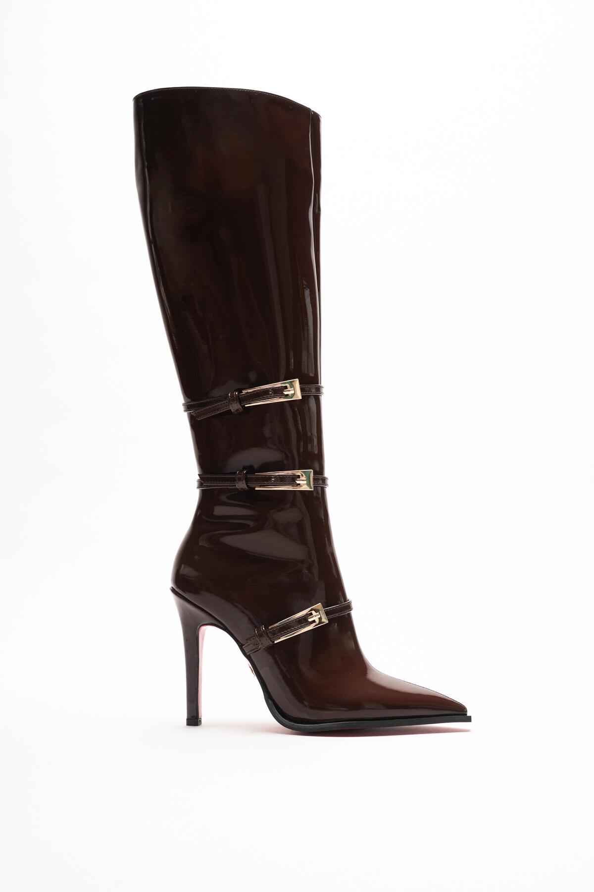 Kombinlerinize cesur bir dokunuş yapmaya hazır mısınız? Kahverengi rugan derinin parlak asaletini, ikonik kırmızı taban detayıyla buluşturan bu özel tasarım çizme, stil sahibi kadınlar için üretildi.