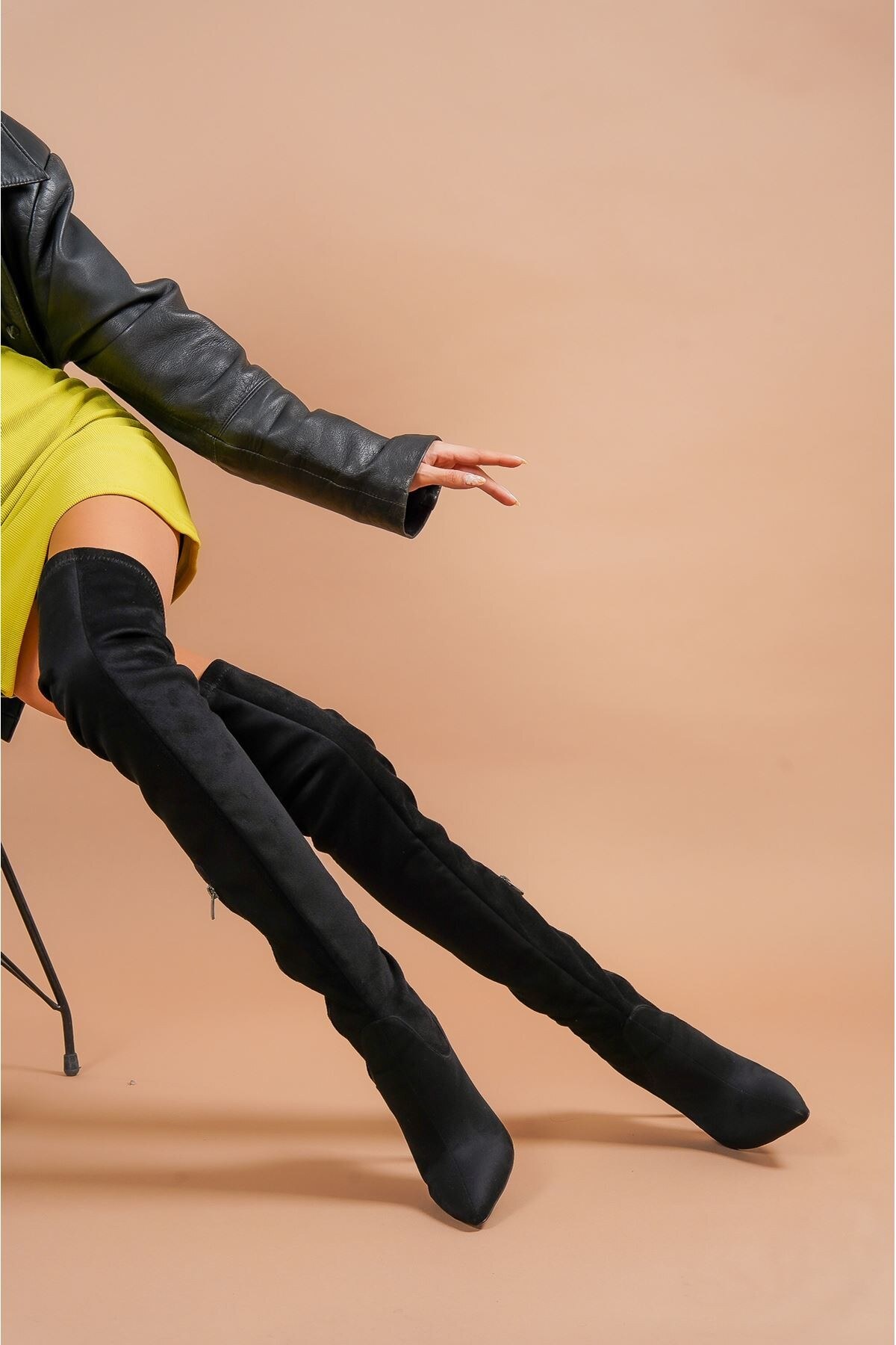 Kadın Yarım Fermuar Diz Üstü Streç Çizme Betty Siyah Süet