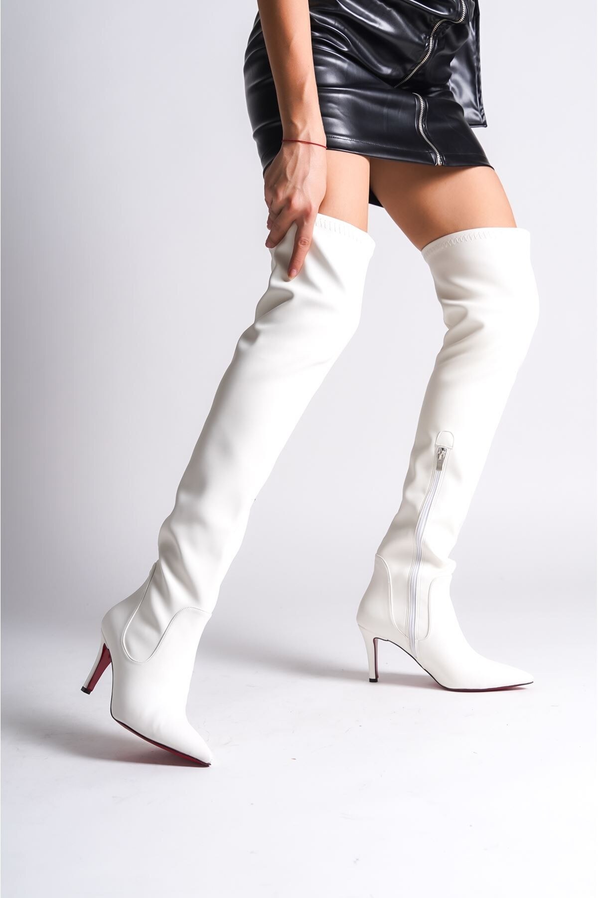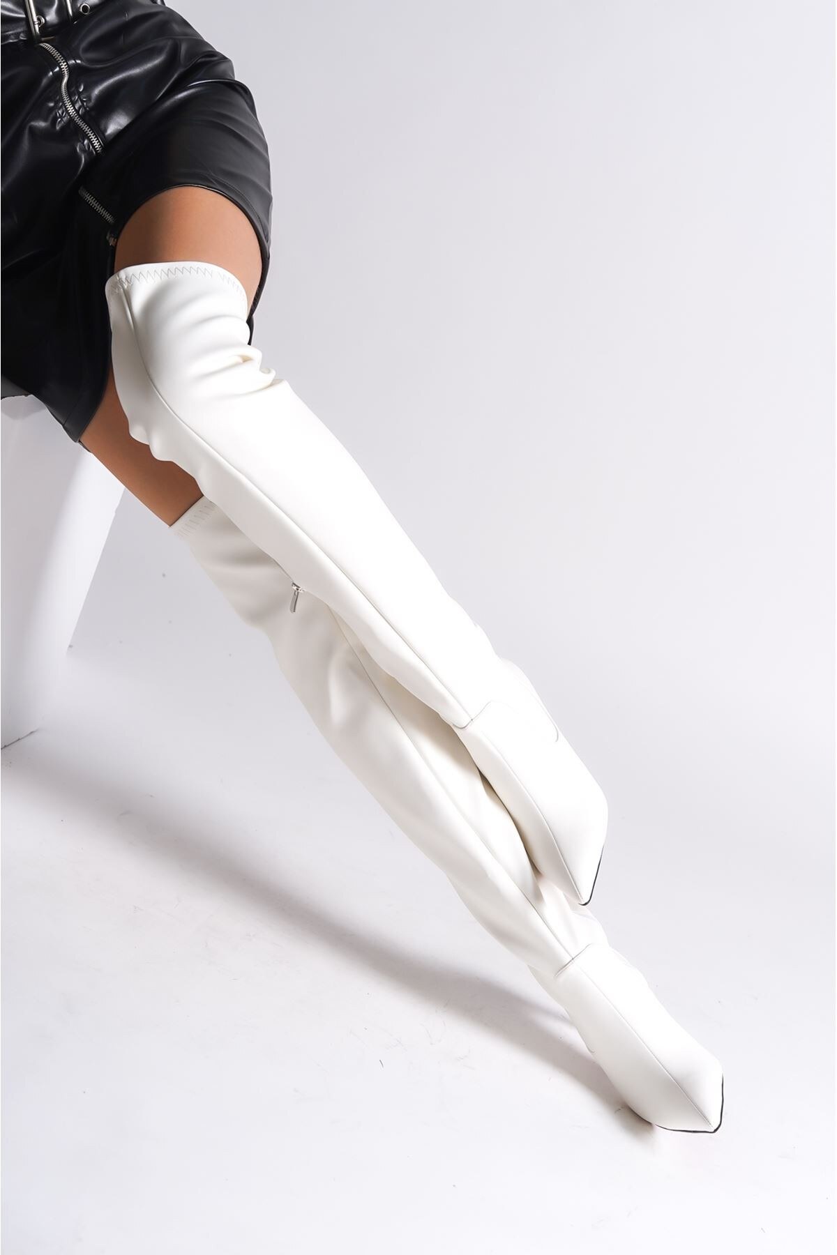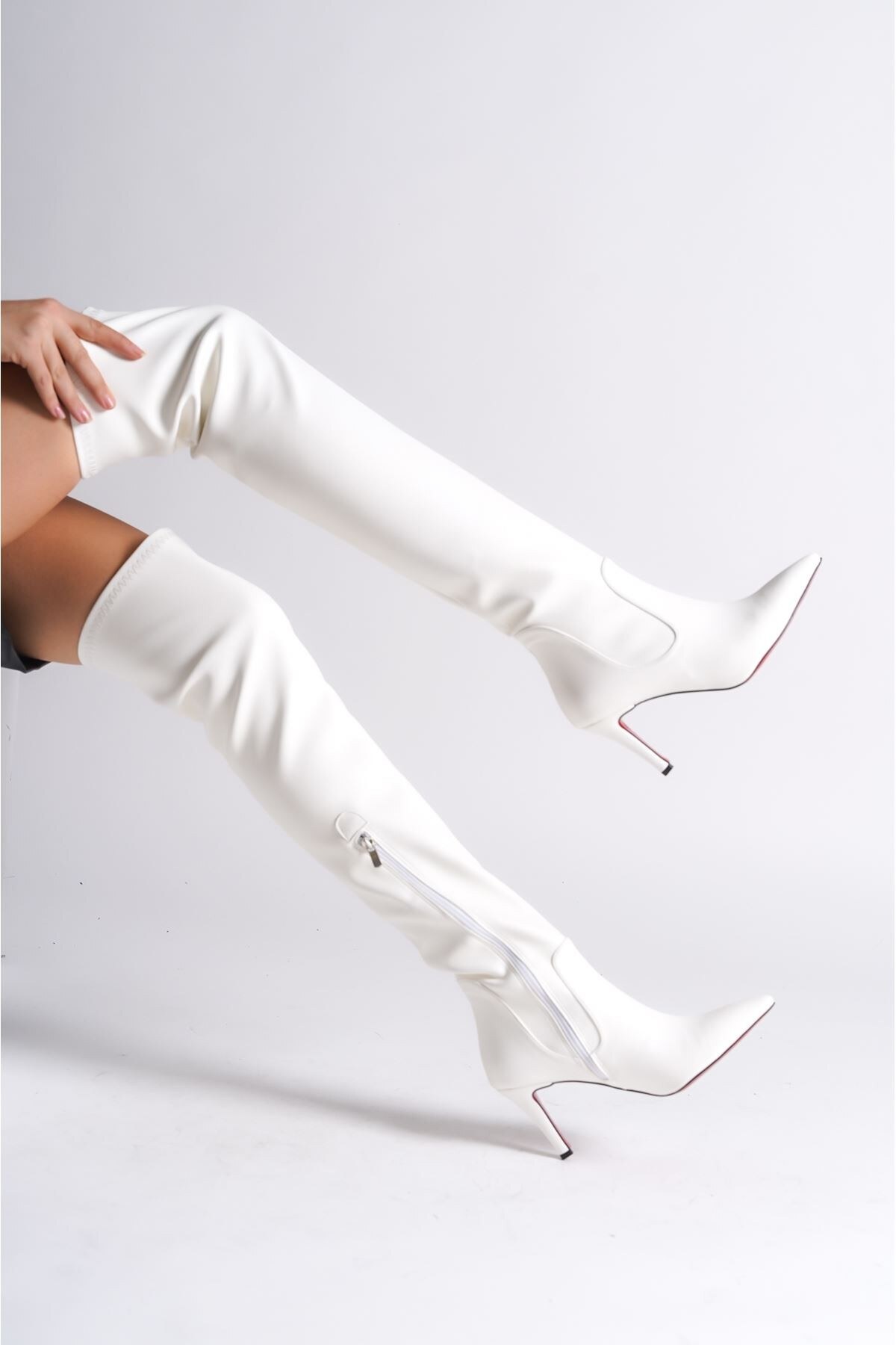 Kadın Yarım Fermuarlı Diz Üstü Streç Çizme Borns Beyaz Cilt