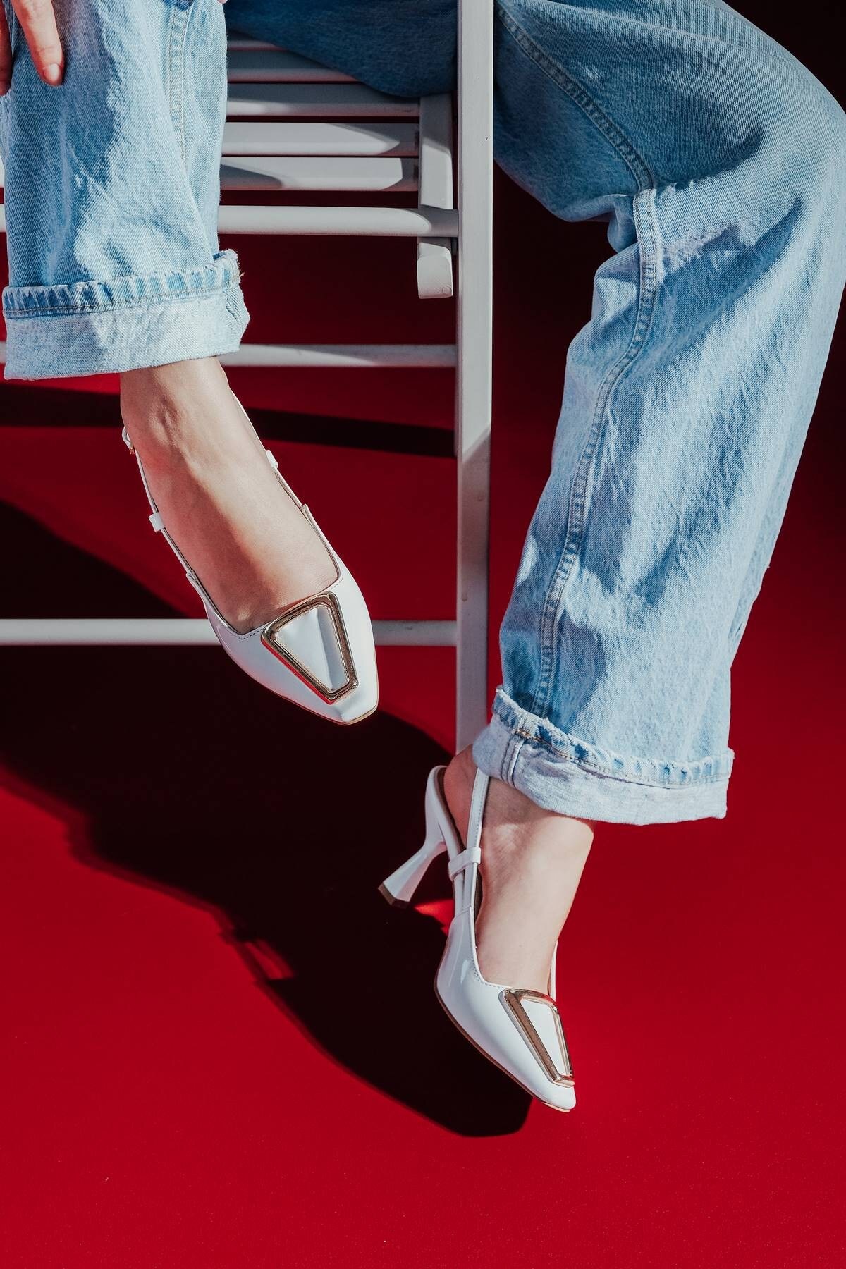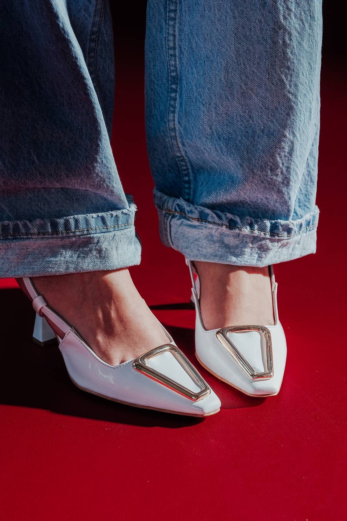 Kadın Tasarım Büyük Toka Detay Kadın Orta Topuklu Ayakkabı Pira Beyaz