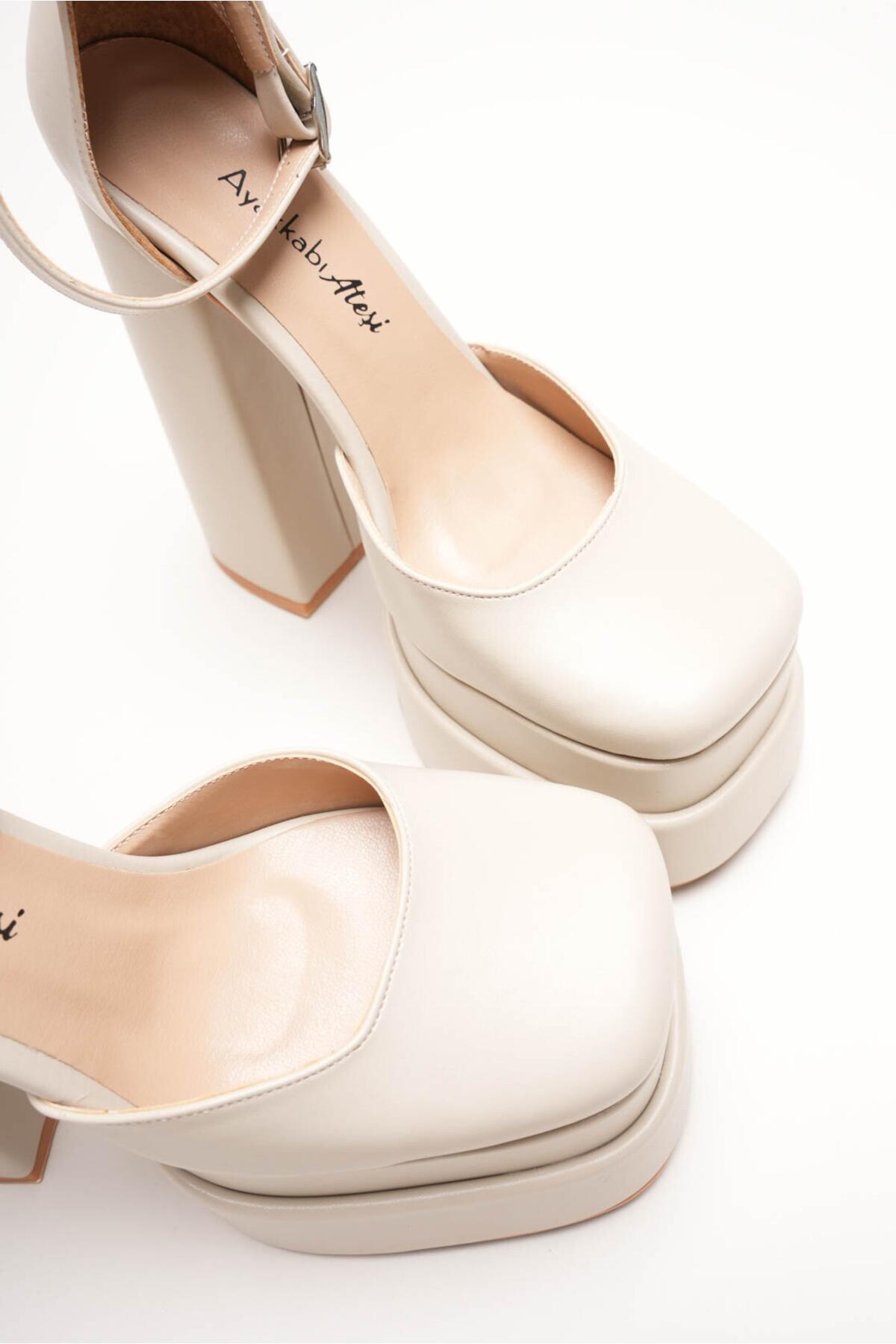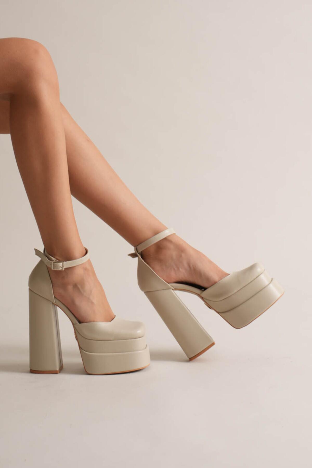 Sezonun en trend akımlarından biri olan çift platform (double platform) modasını yansıtan bu ayakkabı, stilinize anında güçlü ve cesur bir dokunuş katıyor. Bej Cilt dokusu ile lüks bir görünüm sunarken, özel tasarım kalın blok topuğu ile yüksekliğine rağmen maksimum konfor ve denge sağlar.