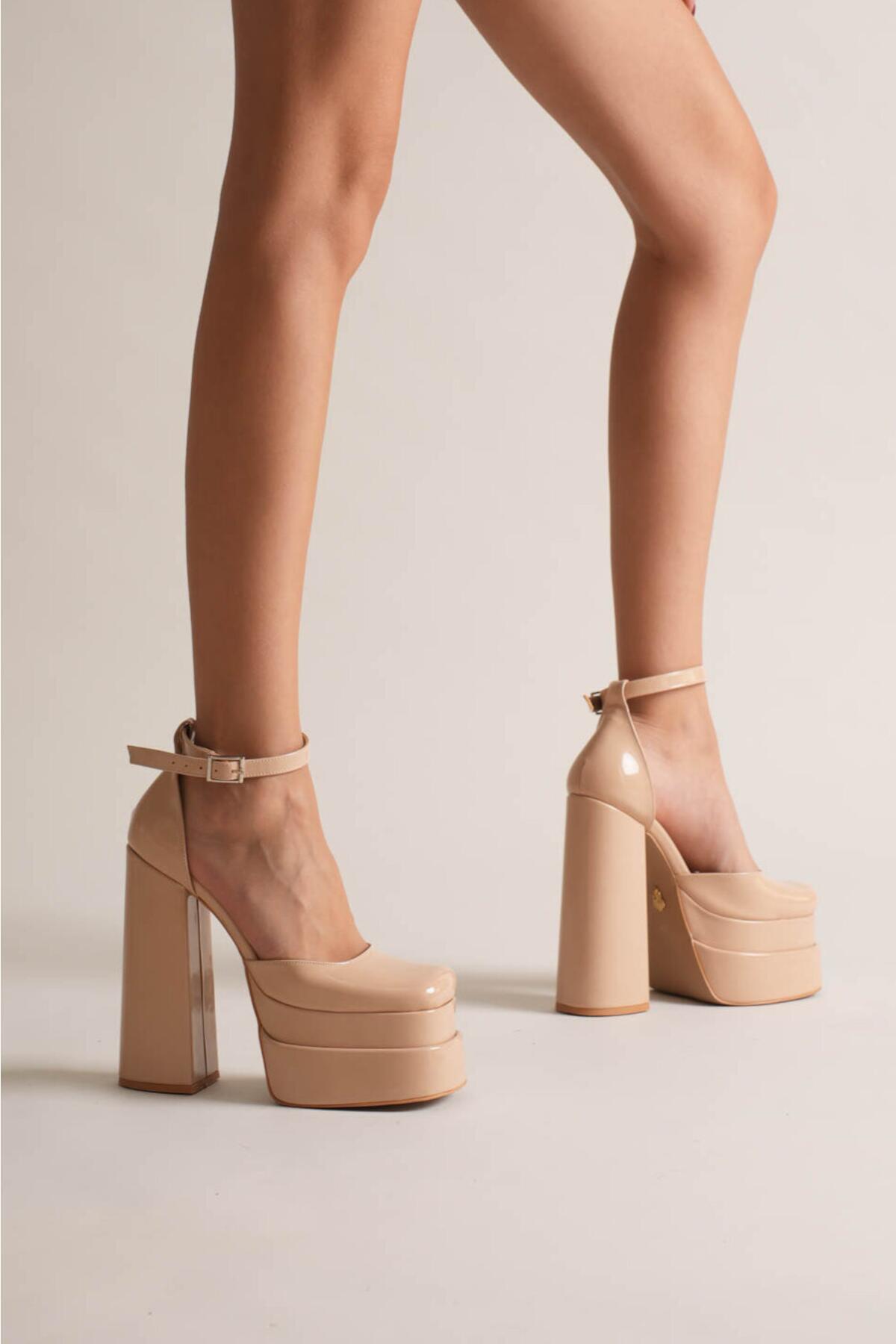 Sezonun en trend akımlarından biri olan çift platform (double platform) modasını yansıtan bu ayakkabı, stilinize anında güçlü ve cesur bir dokunuş katıyor. Nude Rugan dokusu ile lüks bir görünüm sunarken, özel tasarım kalın blok topuğu ile yüksekliğine rağmen maksimum konfor ve denge sağlar.