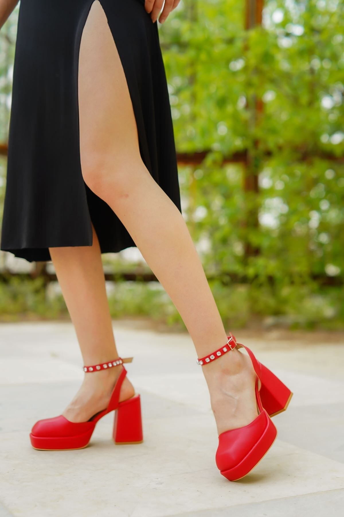 Kadın Alçak Platform Kalın Topuklu Ayakkabı Alice Kırmızı Cilt