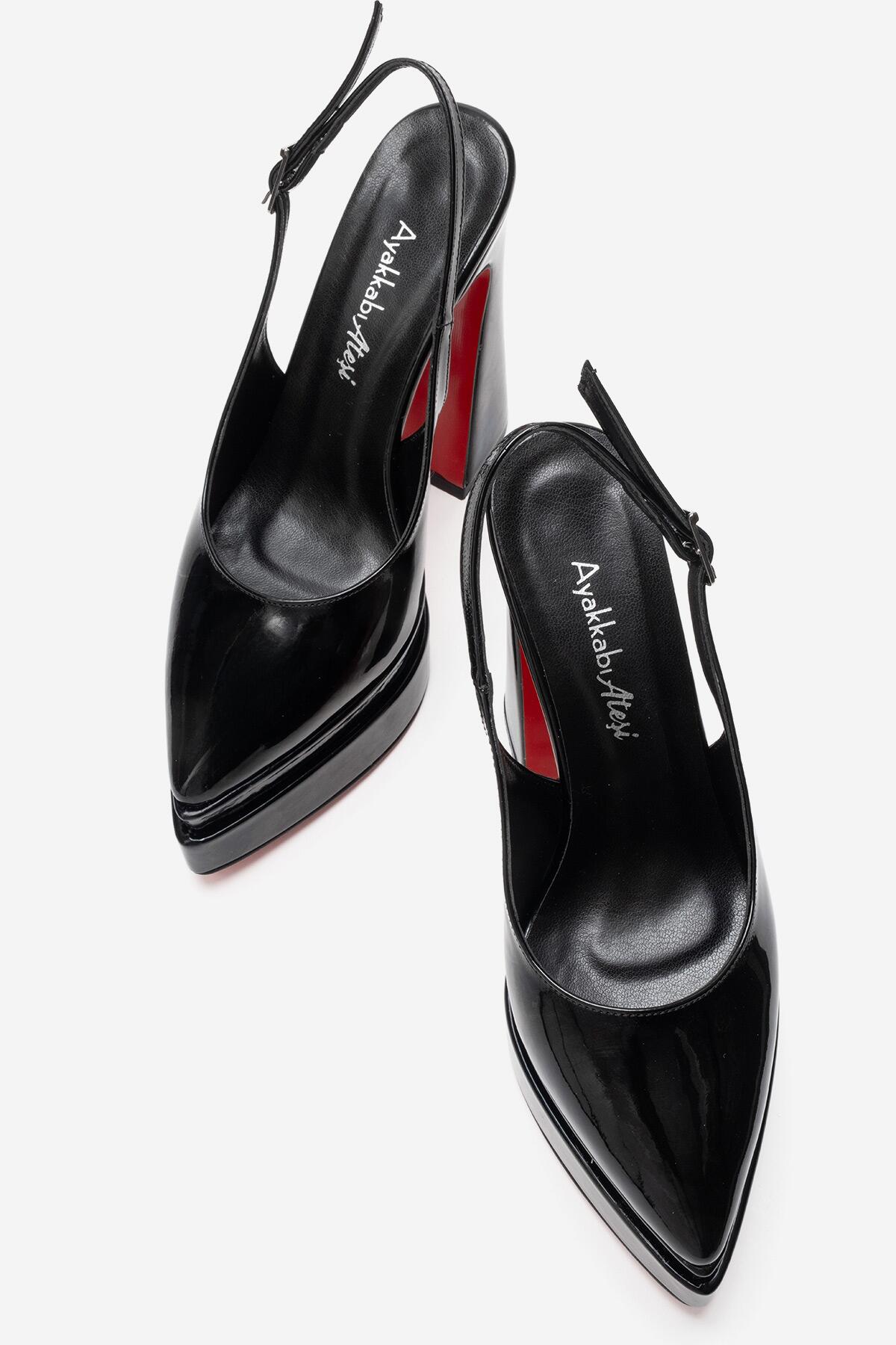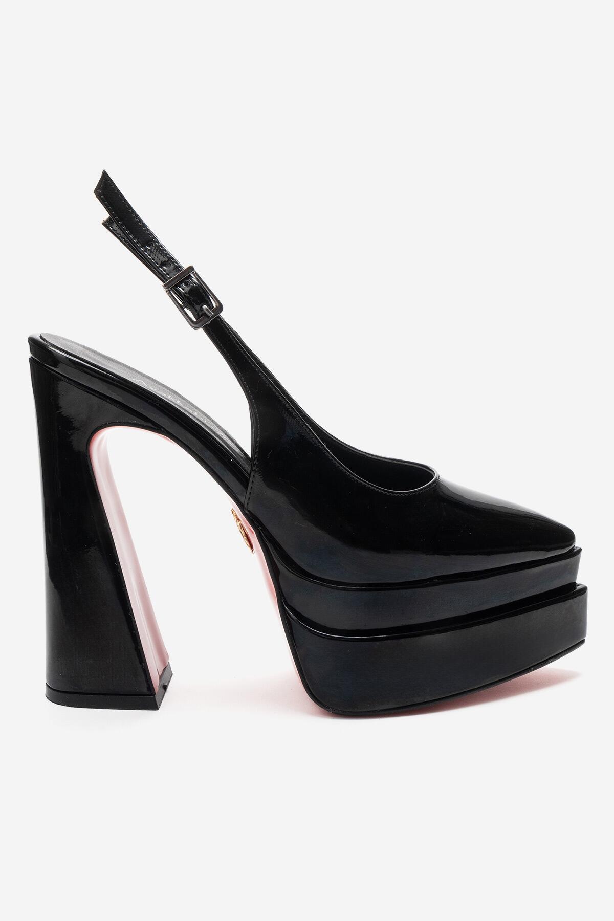 Kadın Arkası Açık Sivri Burun Çift Platform Yüksek Topuklu Ayakkabı Medelo Siyah Rugan
