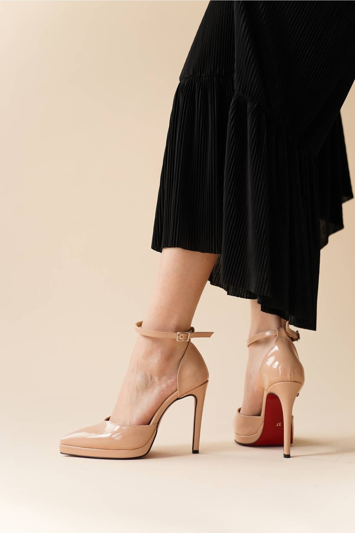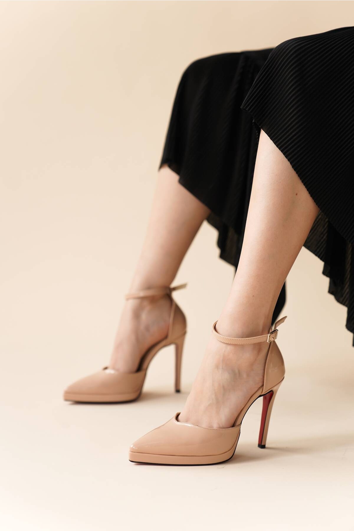 Kadın Baretli Sivri Burun Topuklu Ayakkabı Minora Nude Rugan