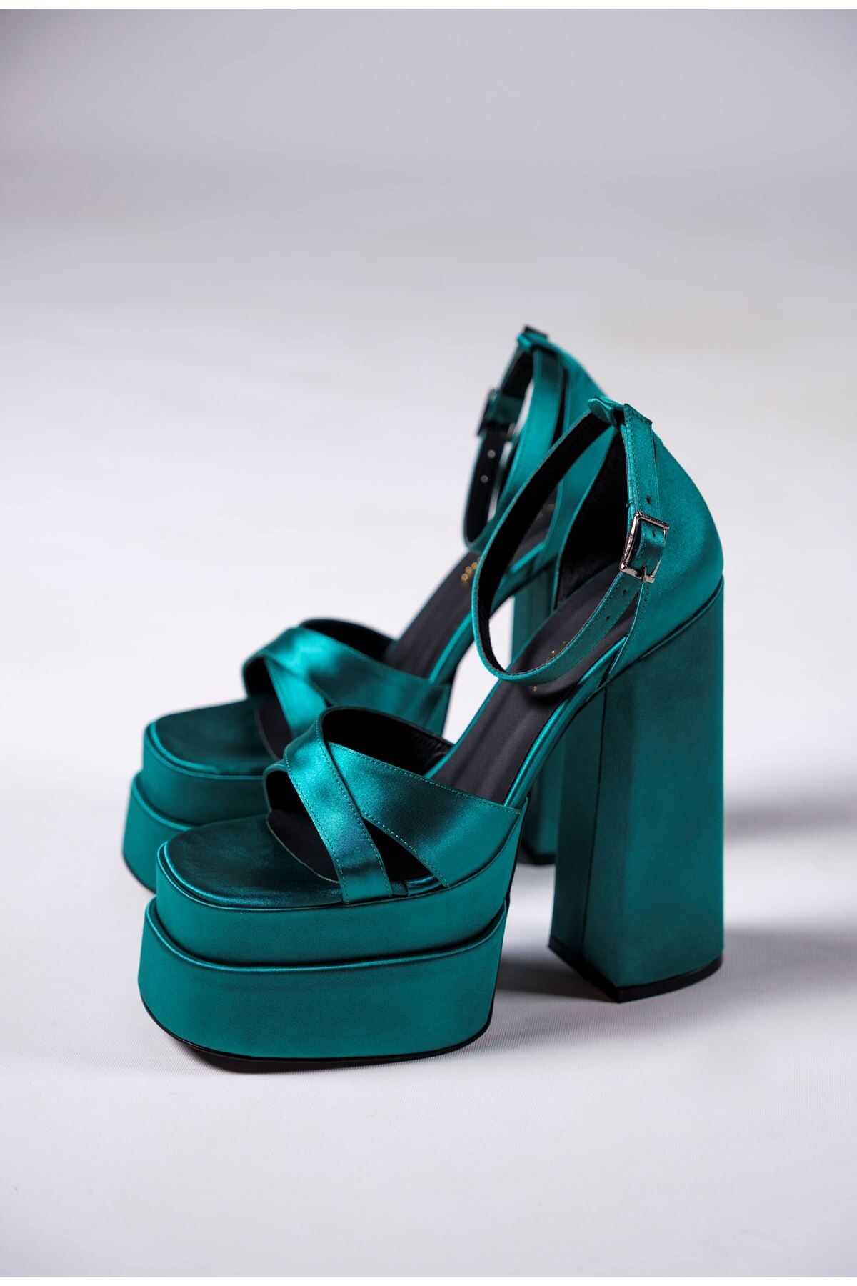 Kadın Çapraz Bant Çift Platform Tasarım Ayakkabı Luxury Yeşil Saten