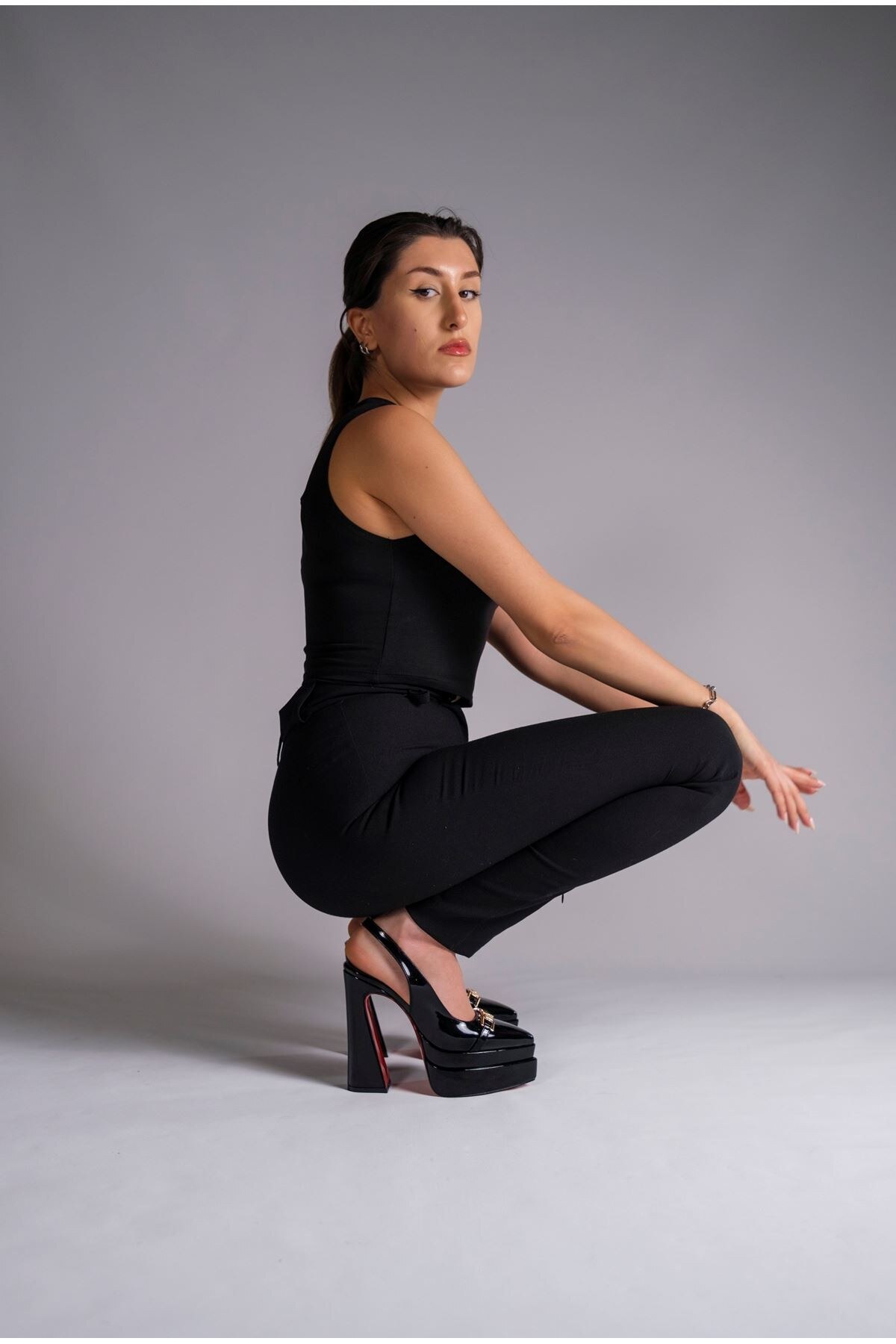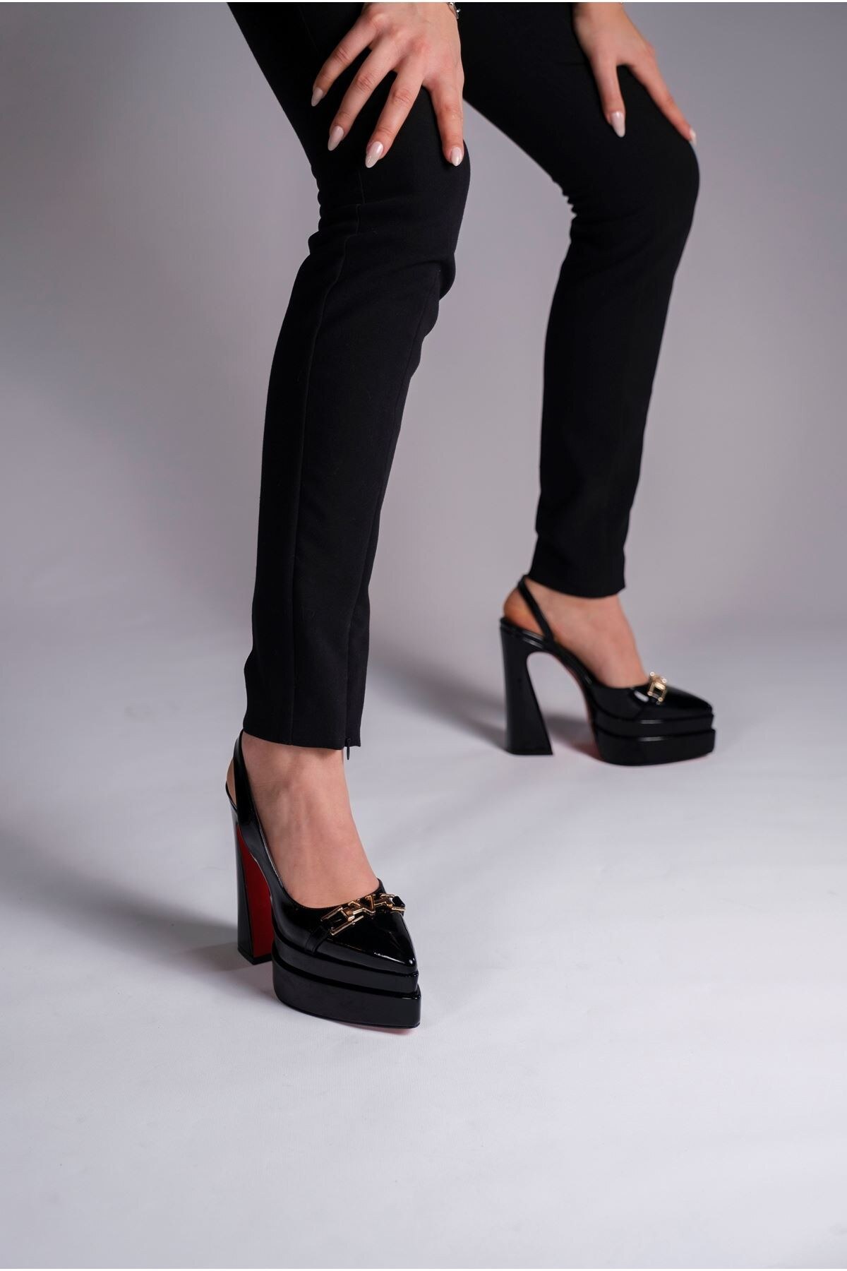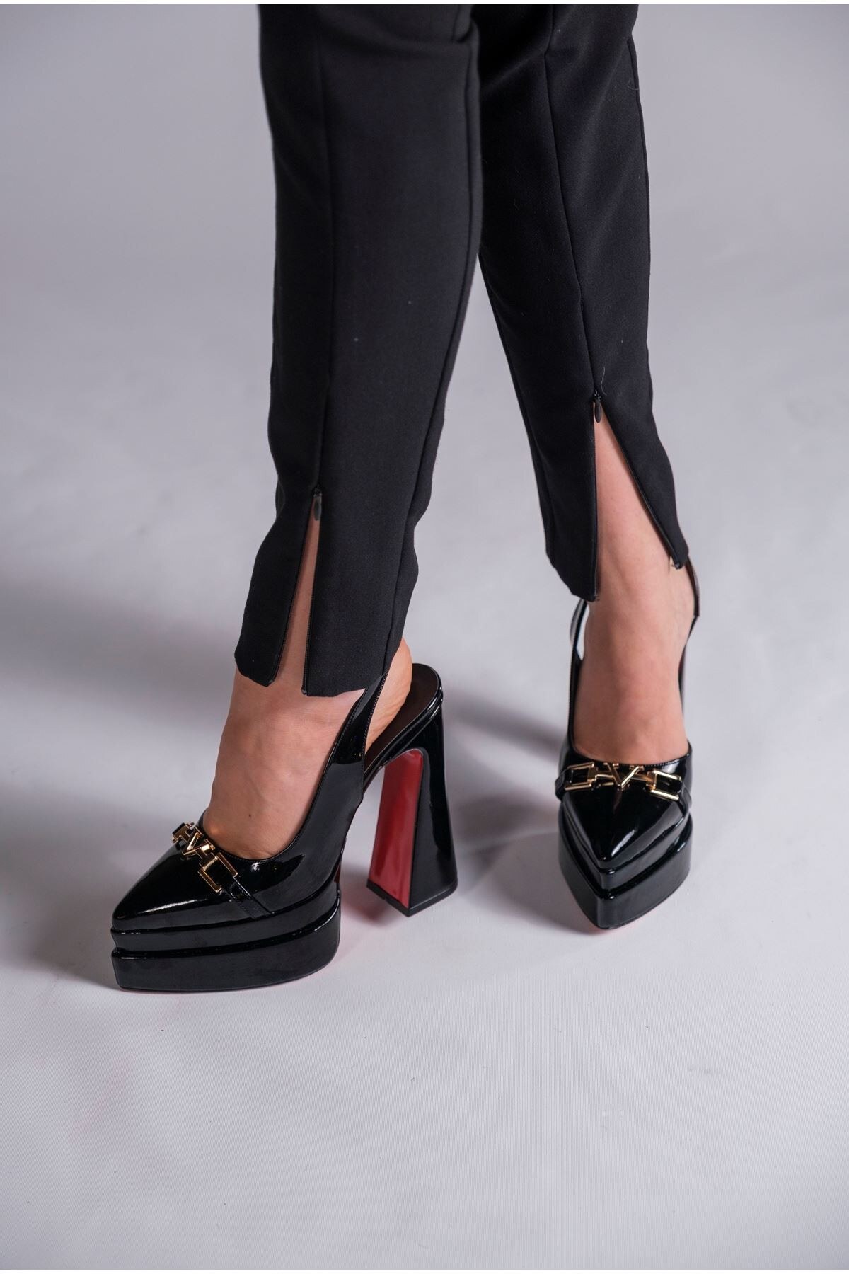 Kadın Çift Platform Tasarım Arka Açık Yüksek Topuklu Ayakkabı Pacha Siyah Rugan