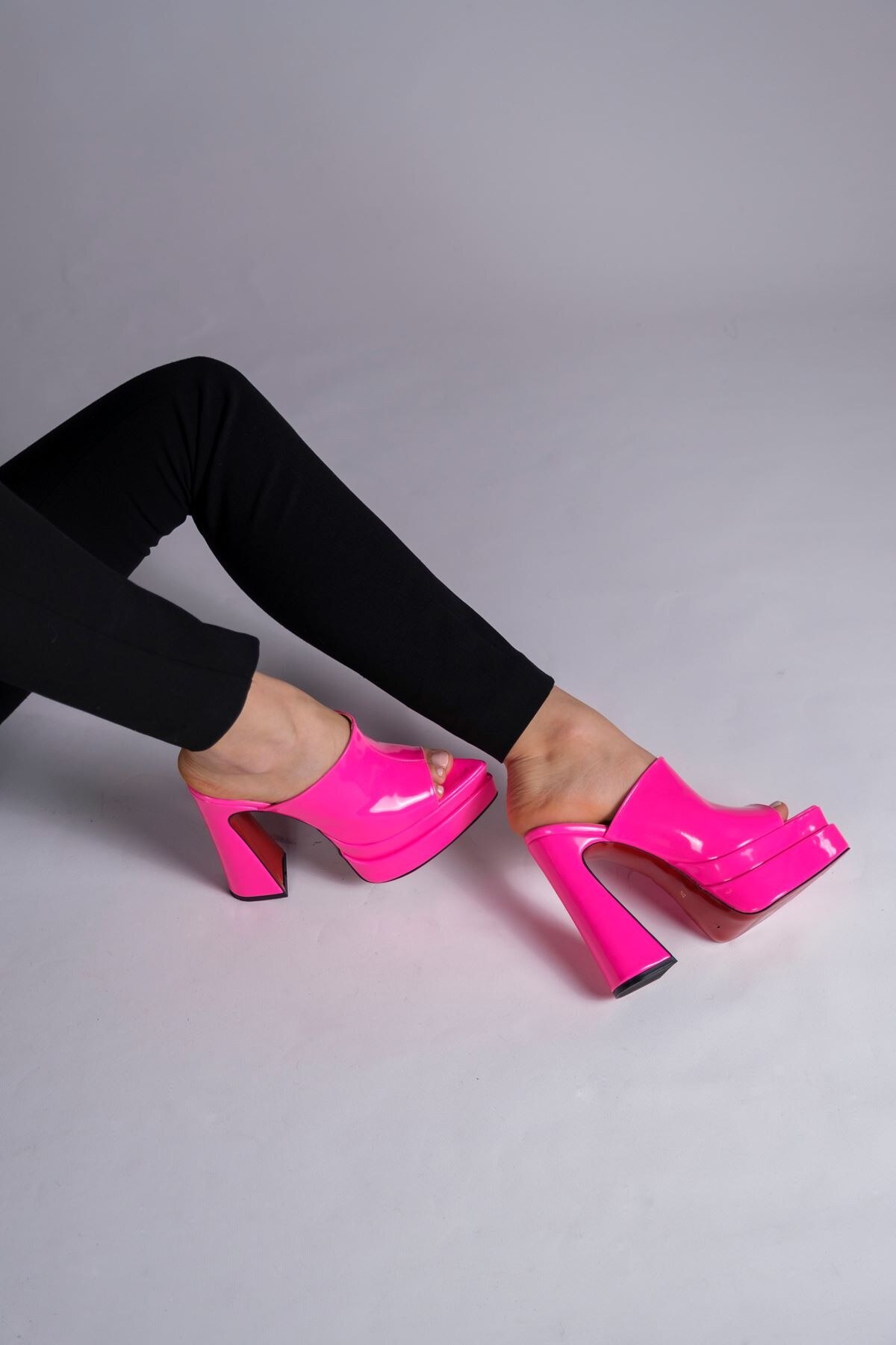 Kadın Çift Platform Tasarım Burnu Kapalı Yüksek Topuklu Terlik Farah Fuşya Rugan