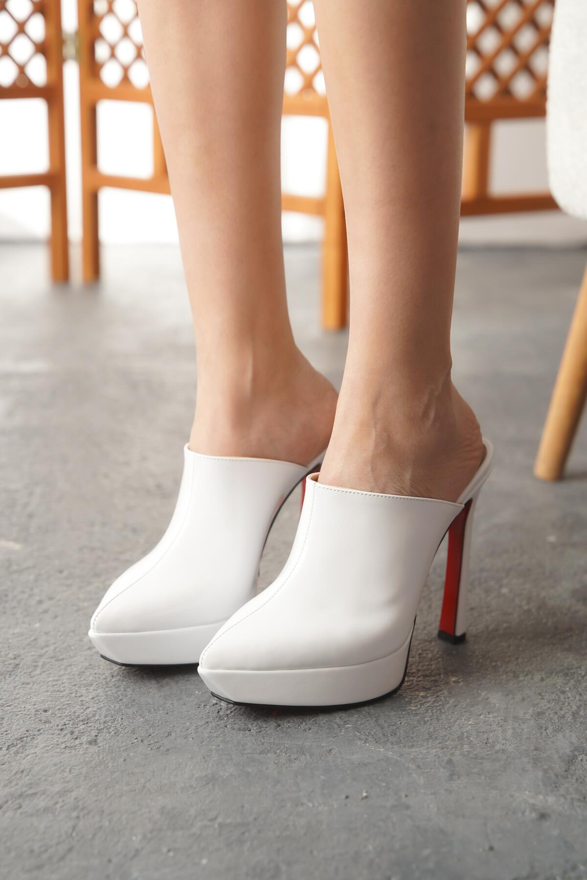 Kadın İnce Topuklu Platform Terlik Sisie Beyaz Rugan