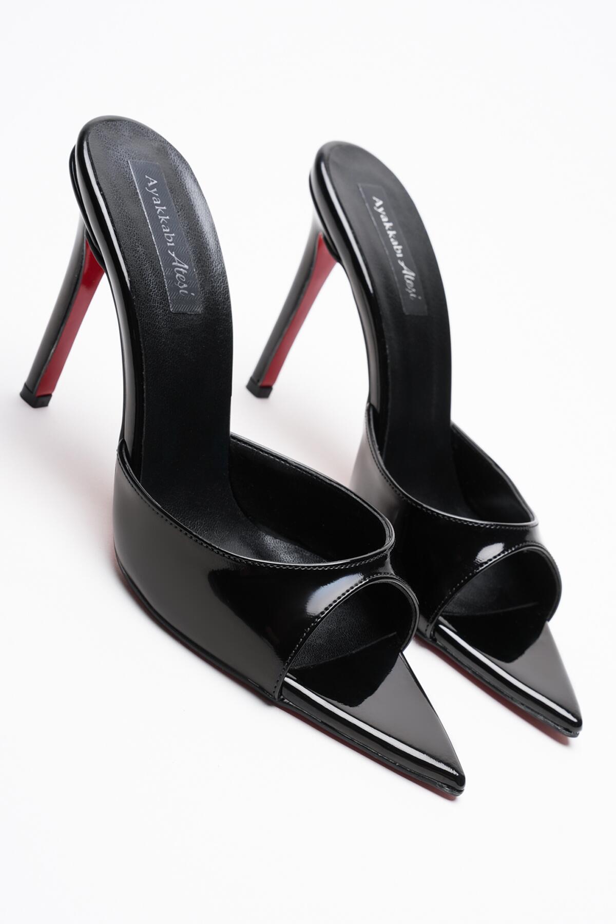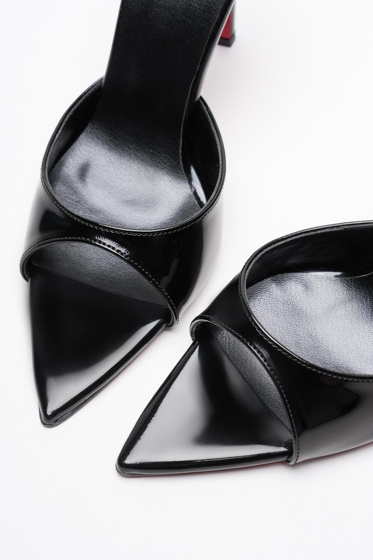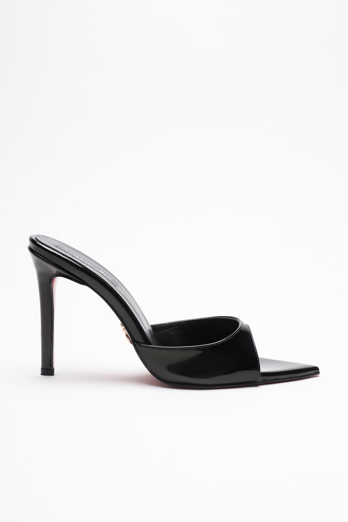 Kadın Sivri Burun İnce Topuklu Terlik Sona Siyah Rugan
