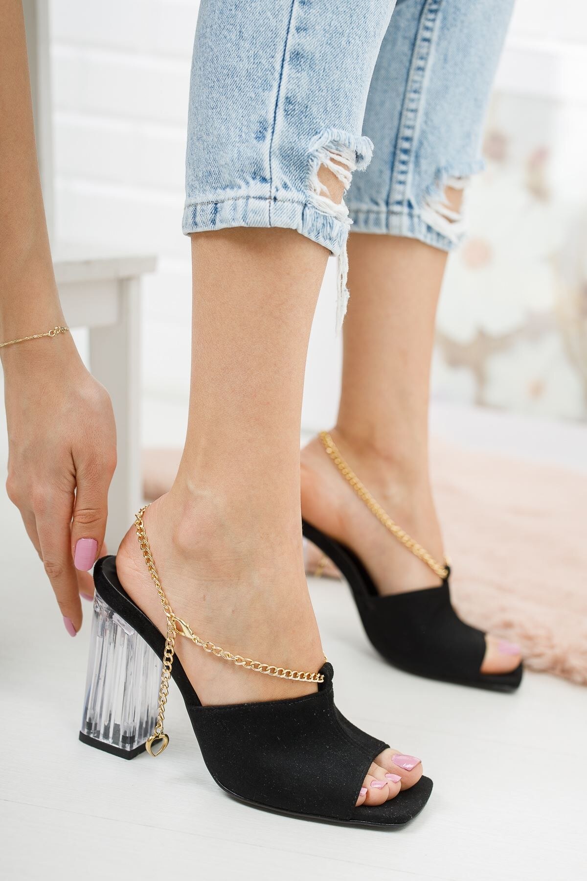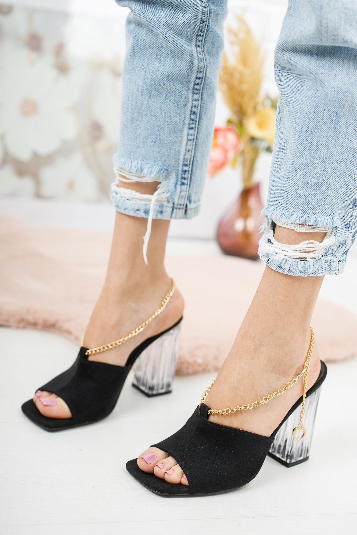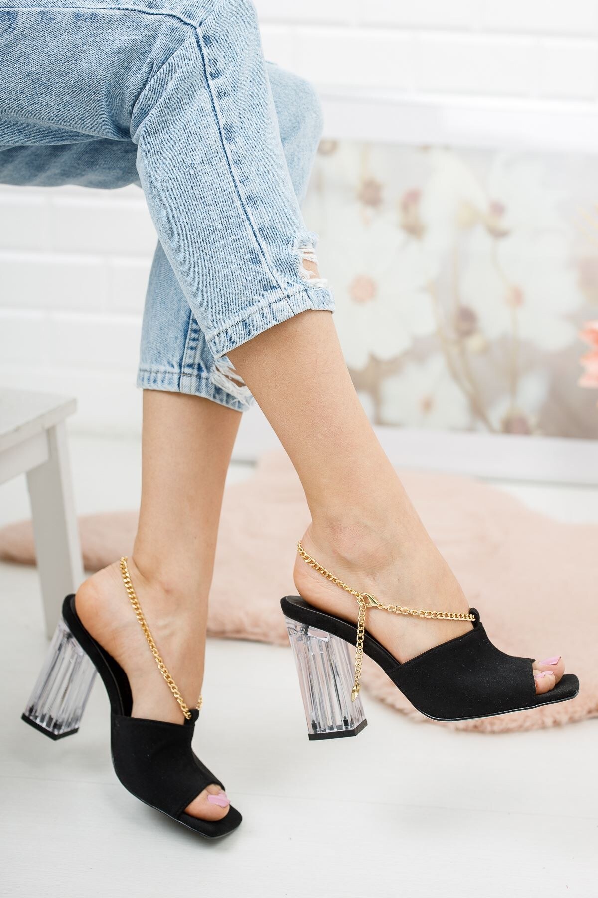 Kadın Zincir Detaylı Şeffaf Topuklu Terlik Clevna Siyah Süet
