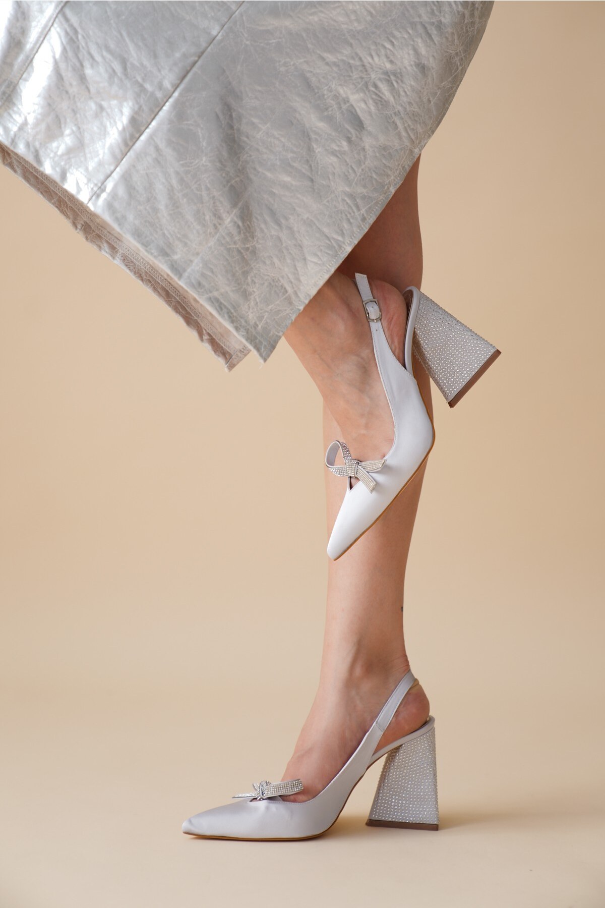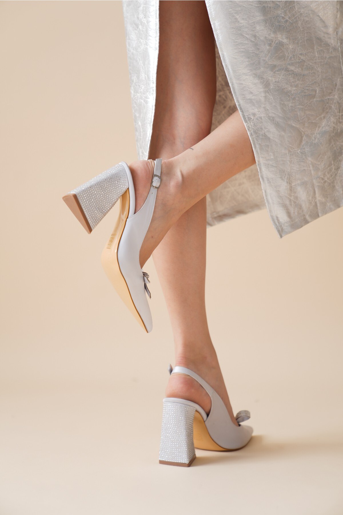 Açık Gri Saten Tokalı Tasarım Topuklu Ayakkabı Hriya Gri Saten