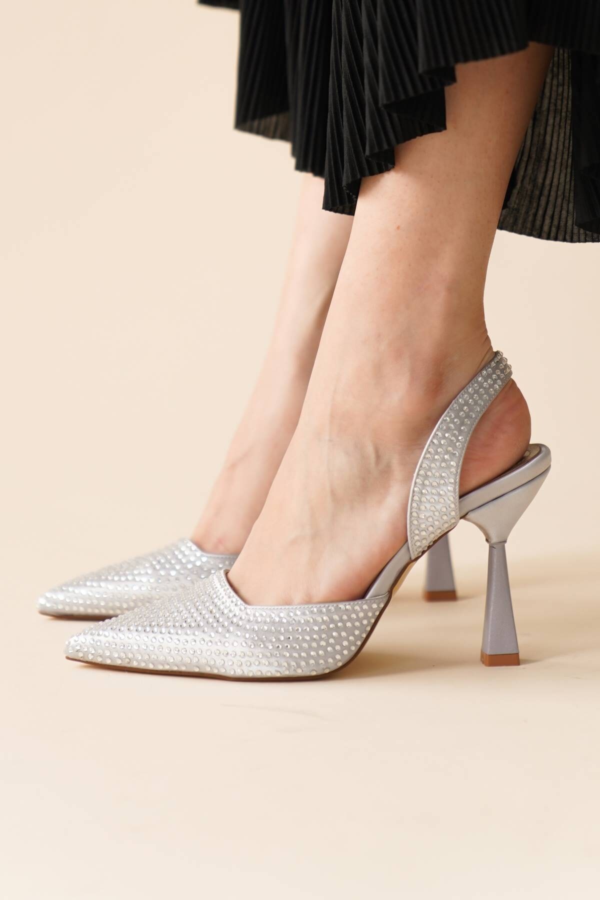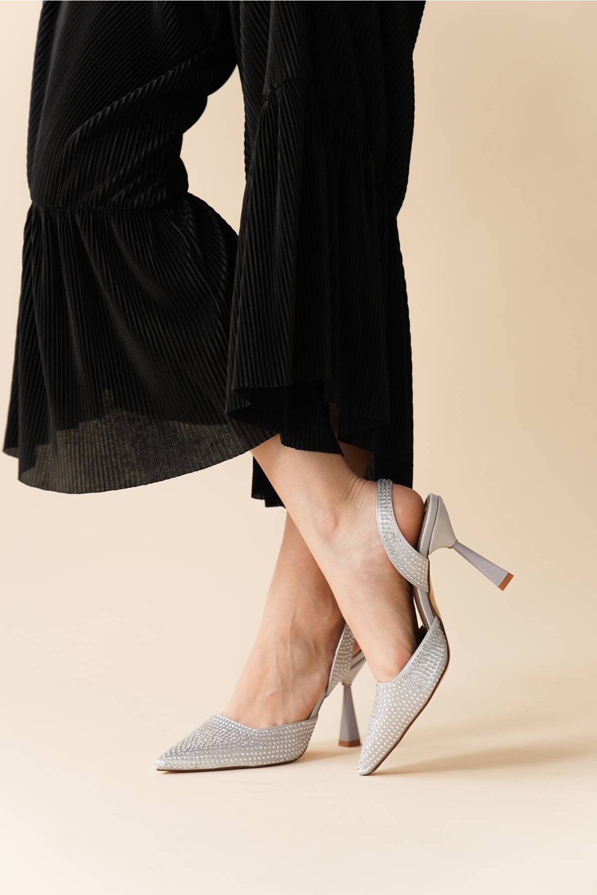 Gri Saten Taş Baskılı Kadın Tasarım Topuklu Ayakkabı Tassie Gri Saten