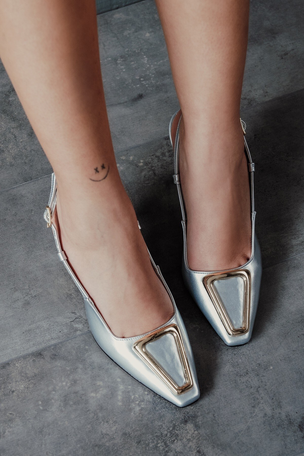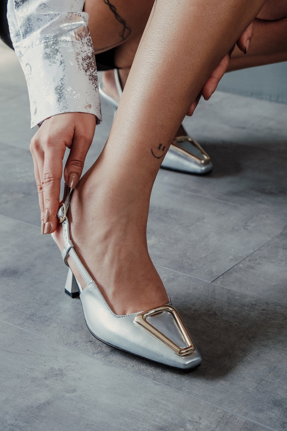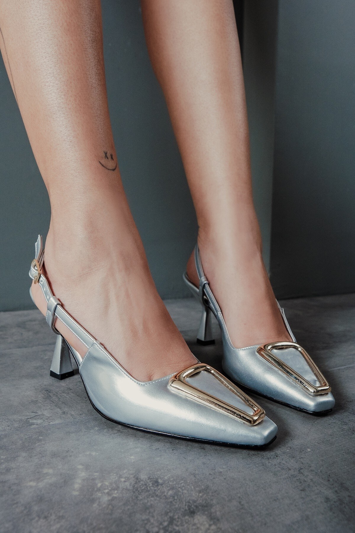 Kadın Tasarım Büyük Toka Detay Kadın Orta Topuklu Ayakkabı Pira Gümüş
