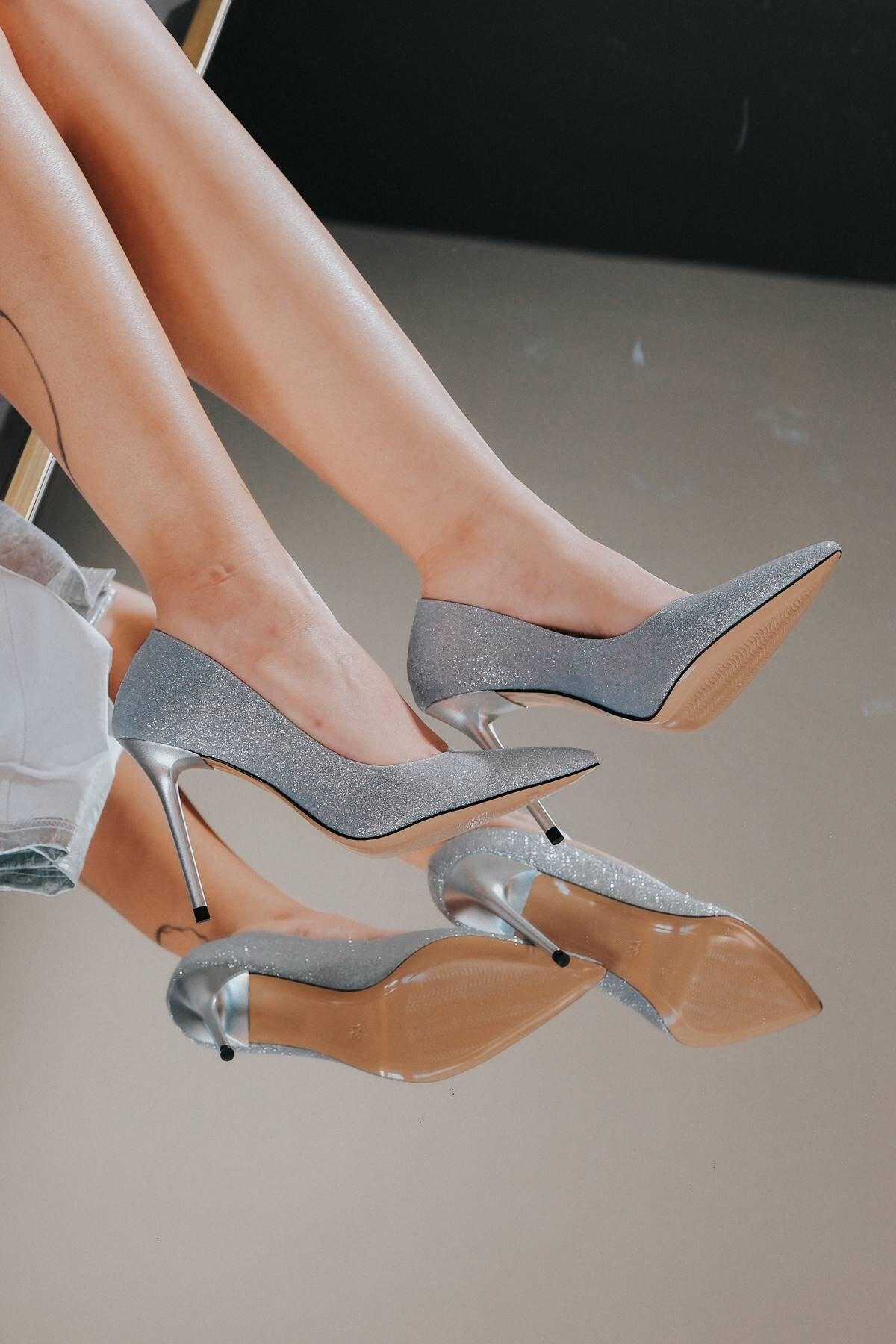Gümüş Sim İnce Topuk Sivri Burunlu Kadın Stiletto Osama Gümüş Sim