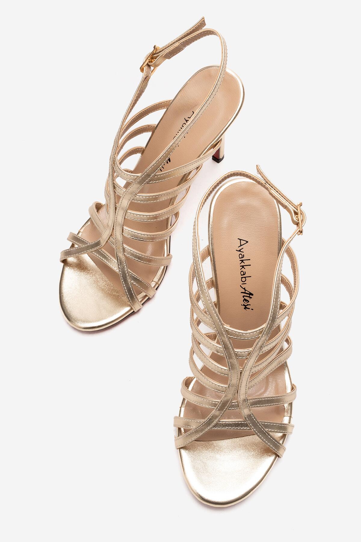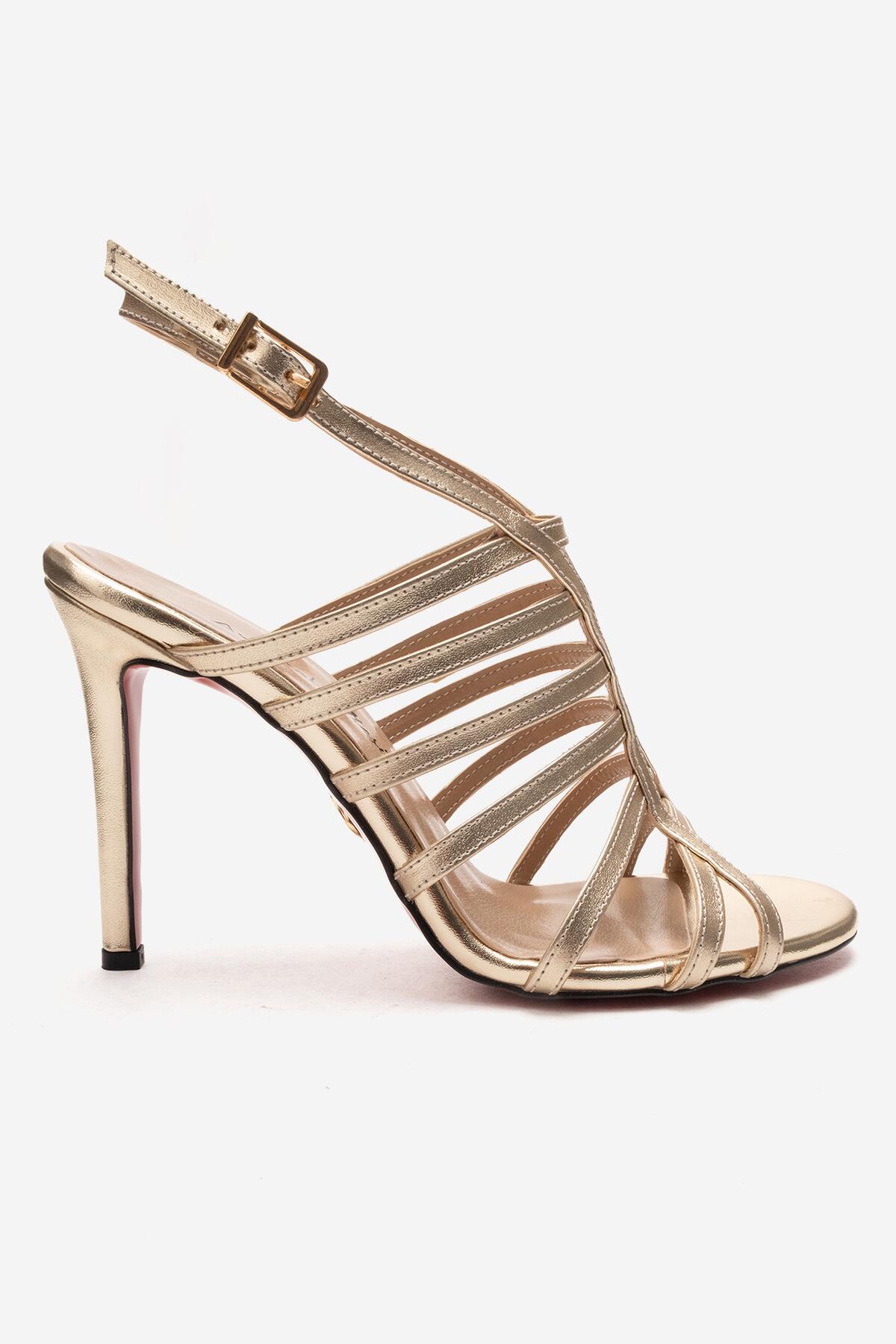 Kadın Açık Kafes Burun Tasarım İnce Topuklu Biyeli Ayakkabı Elo Altın Kırışık