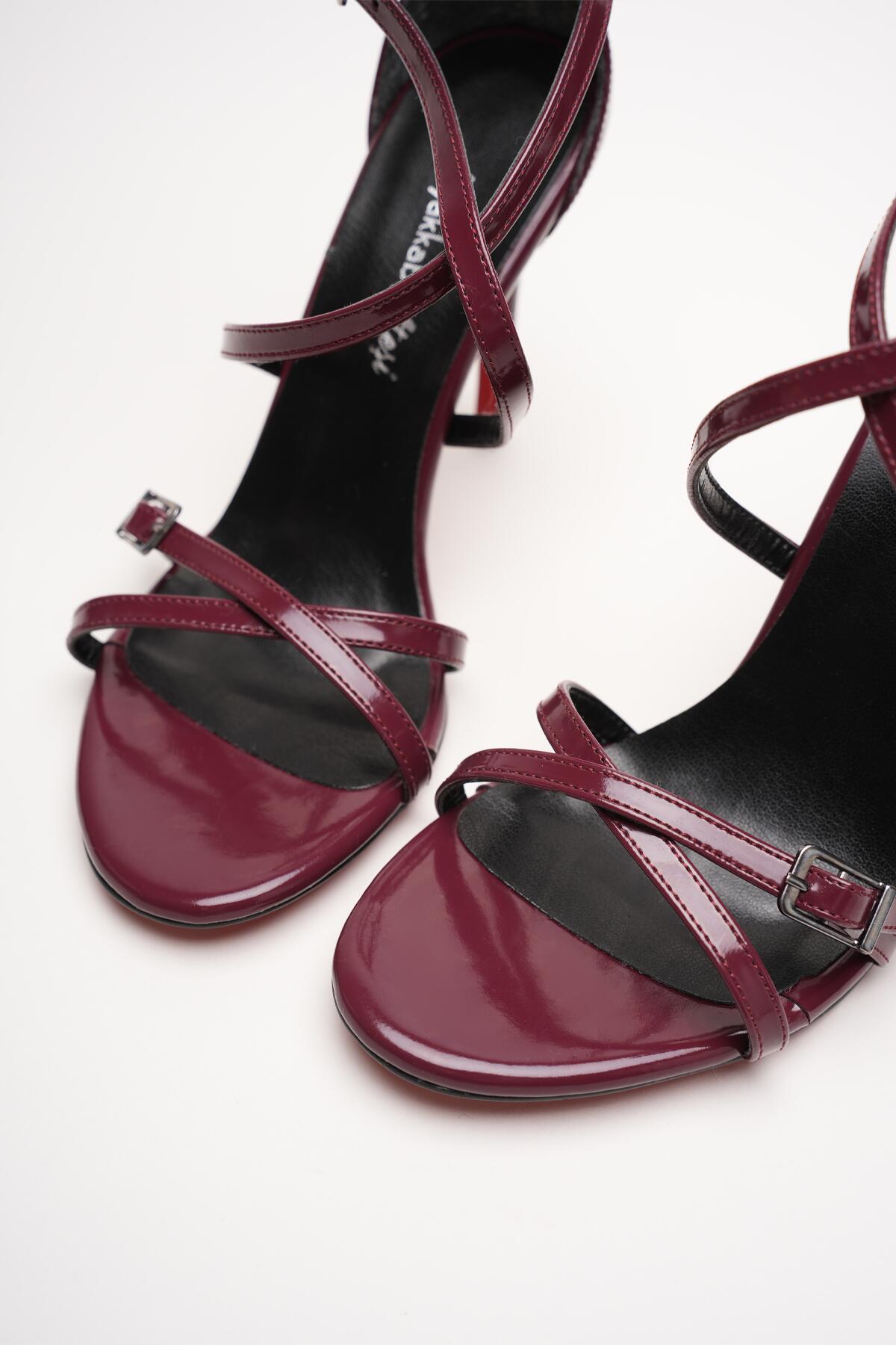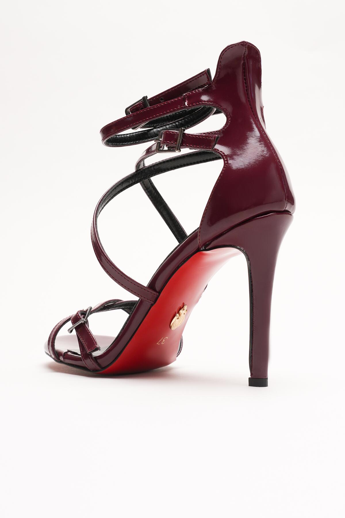 Kadın Biyeli Tokalı İnce Topuklu Ayakkabı Nela Bordo Rugan