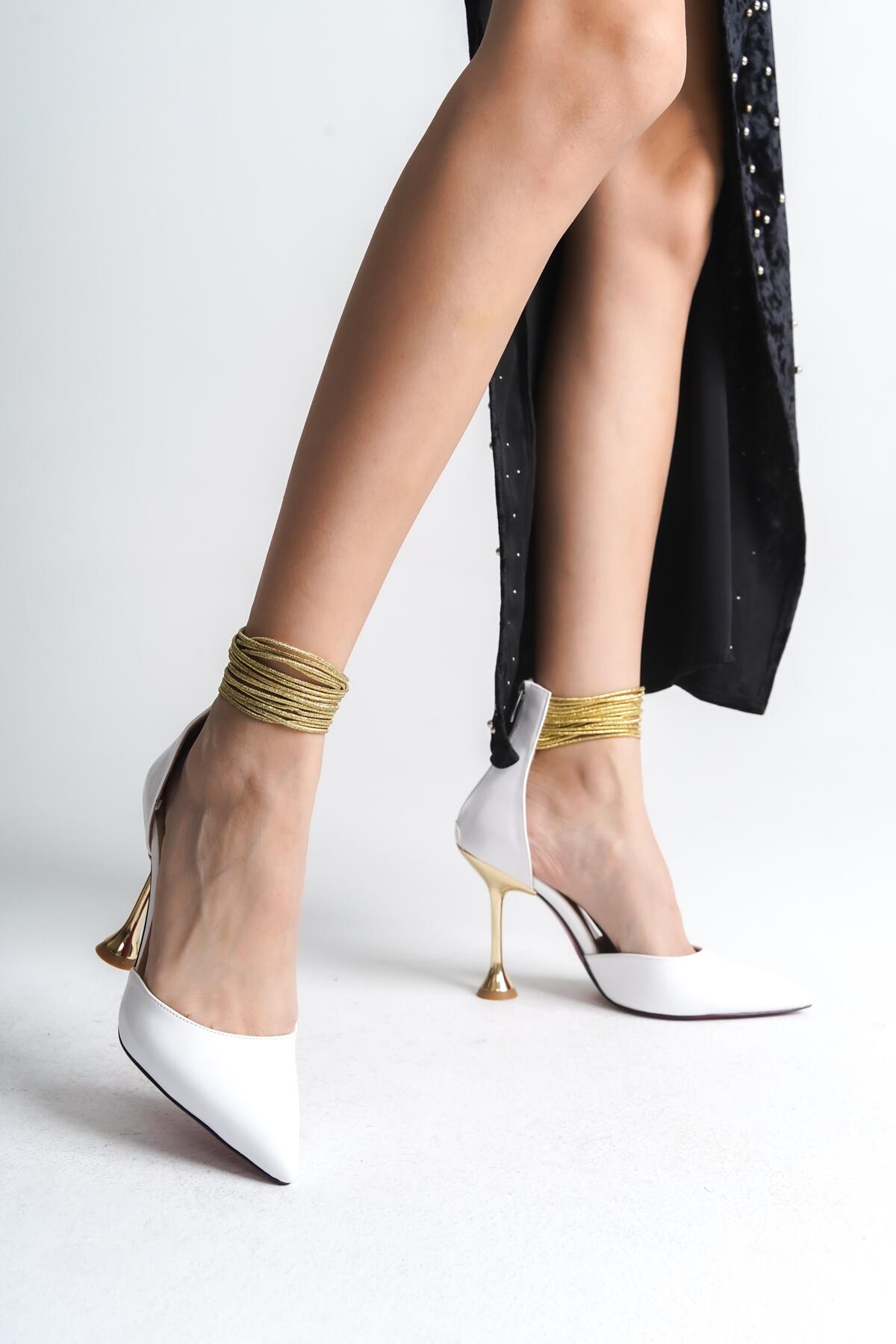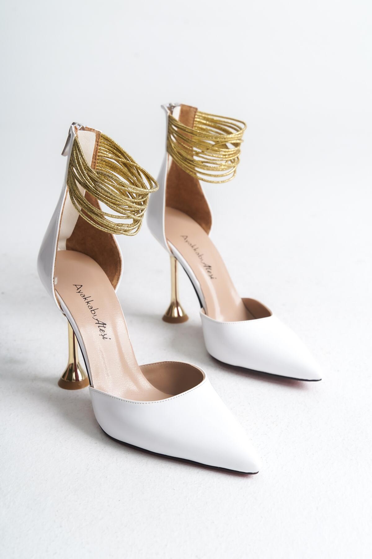 Kadın Gold Biye Detay Tasarım Topuklu Ayakkabı Nicera Beyaz Rugan