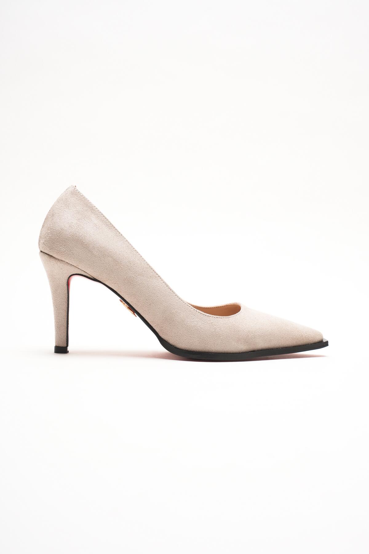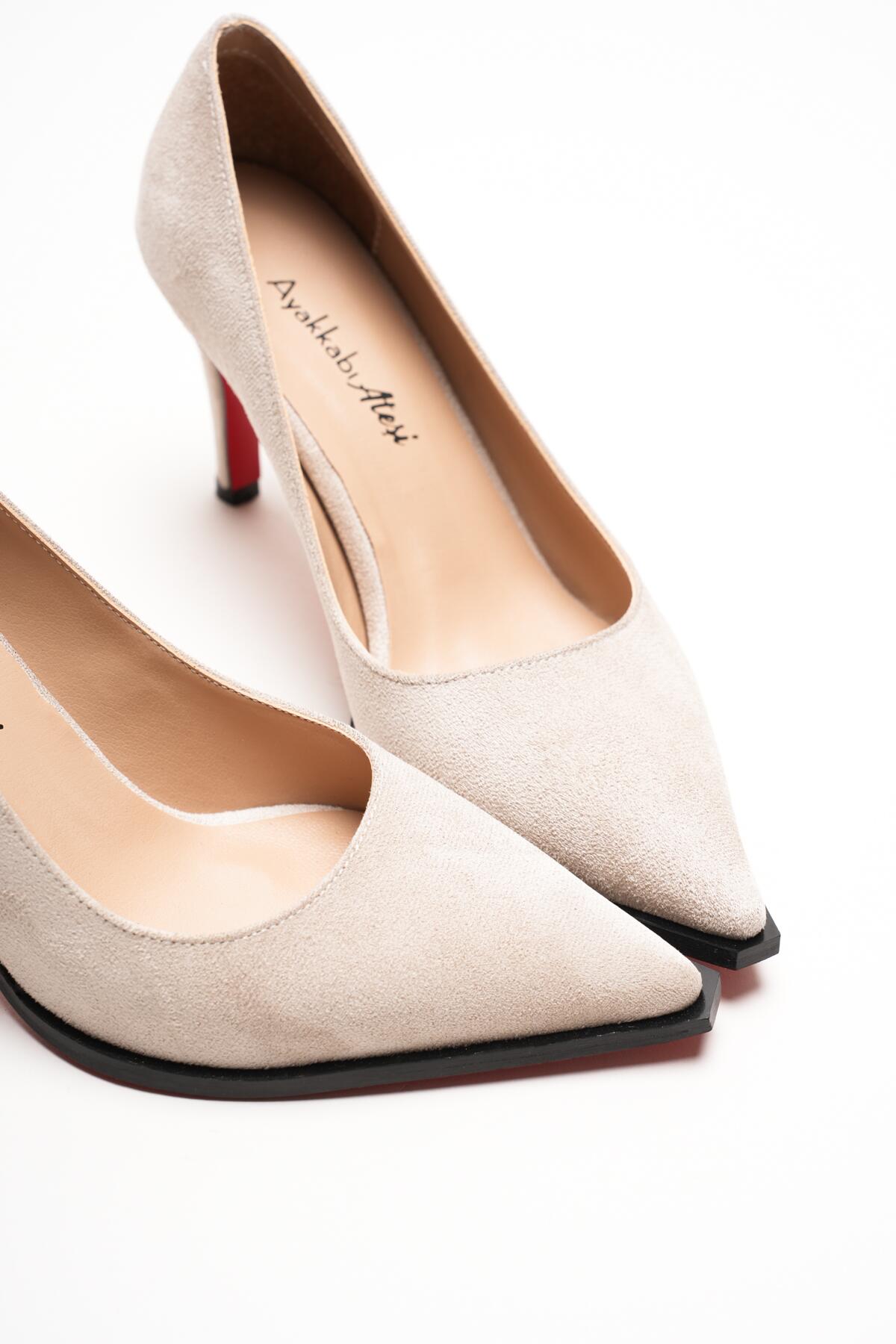 Kadın Sivri Burun Tasarım Taban İnce Kısa Topuklu Ayakkabı Gronia Bej Dana Süet