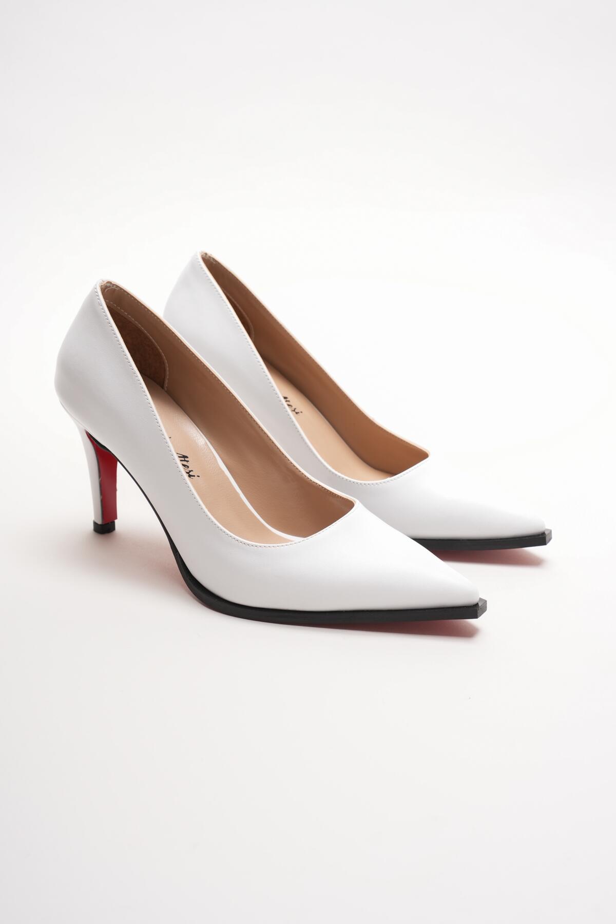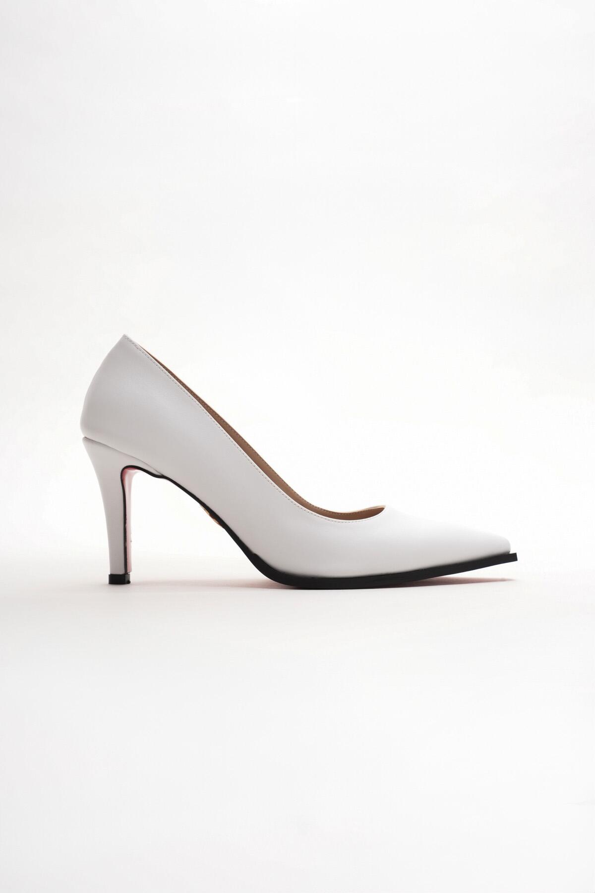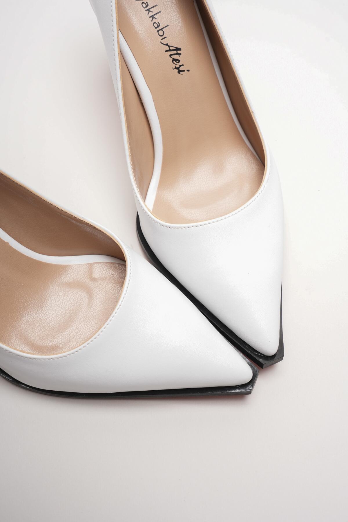 Kadın Sivri Burun Tasarım Taban İnce Kısa Topuklu Ayakkabı Gronia Beyaz Cilt