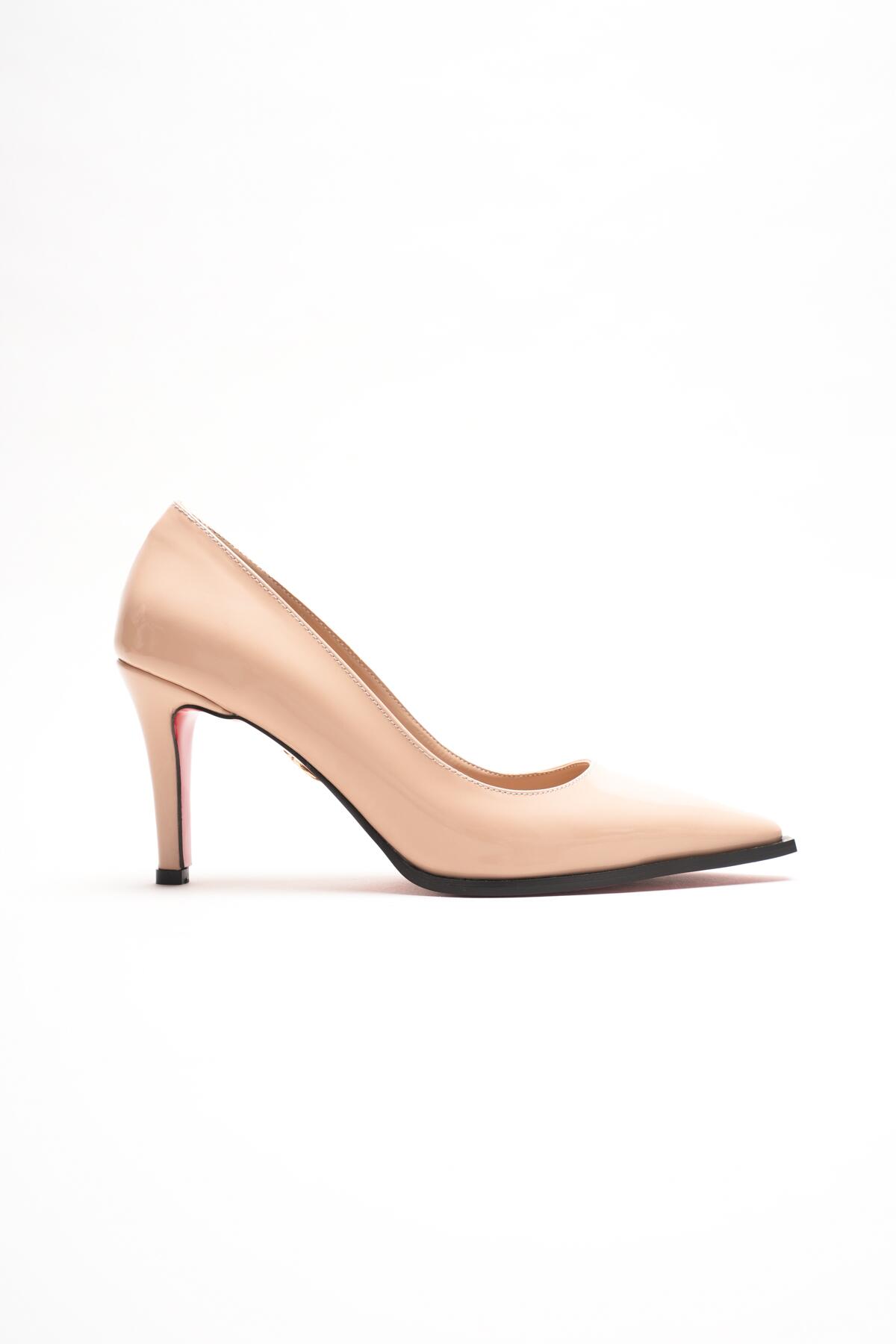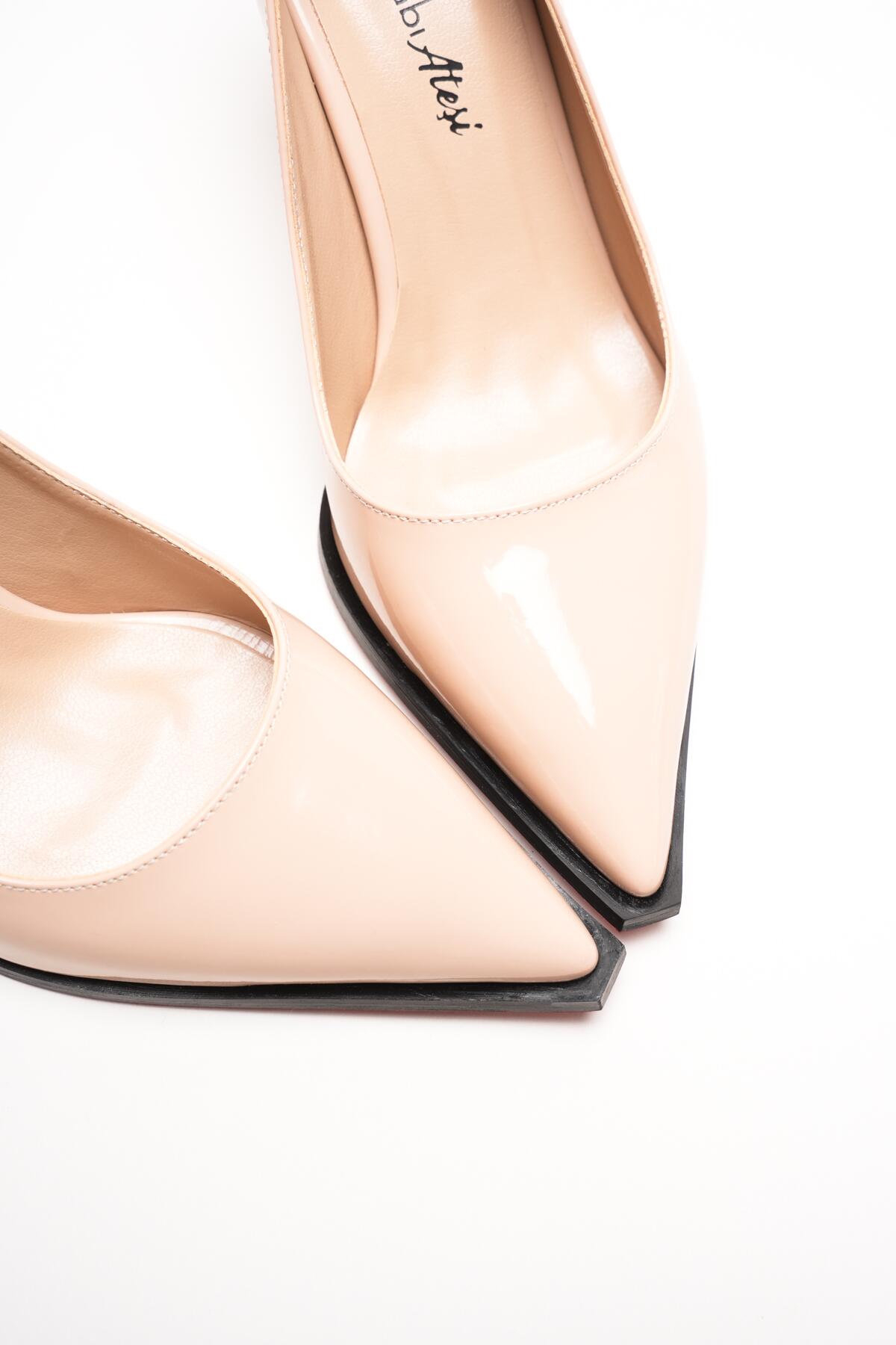 Kadın Sivri Burun Tasarım Taban İnce Kısa Topuklu Ayakkabı Gronia Nude Rugan
