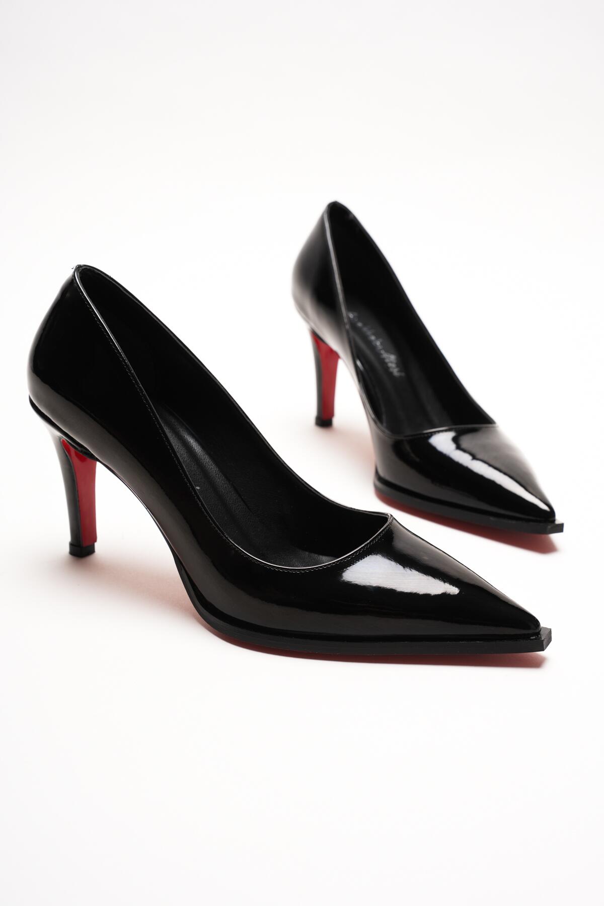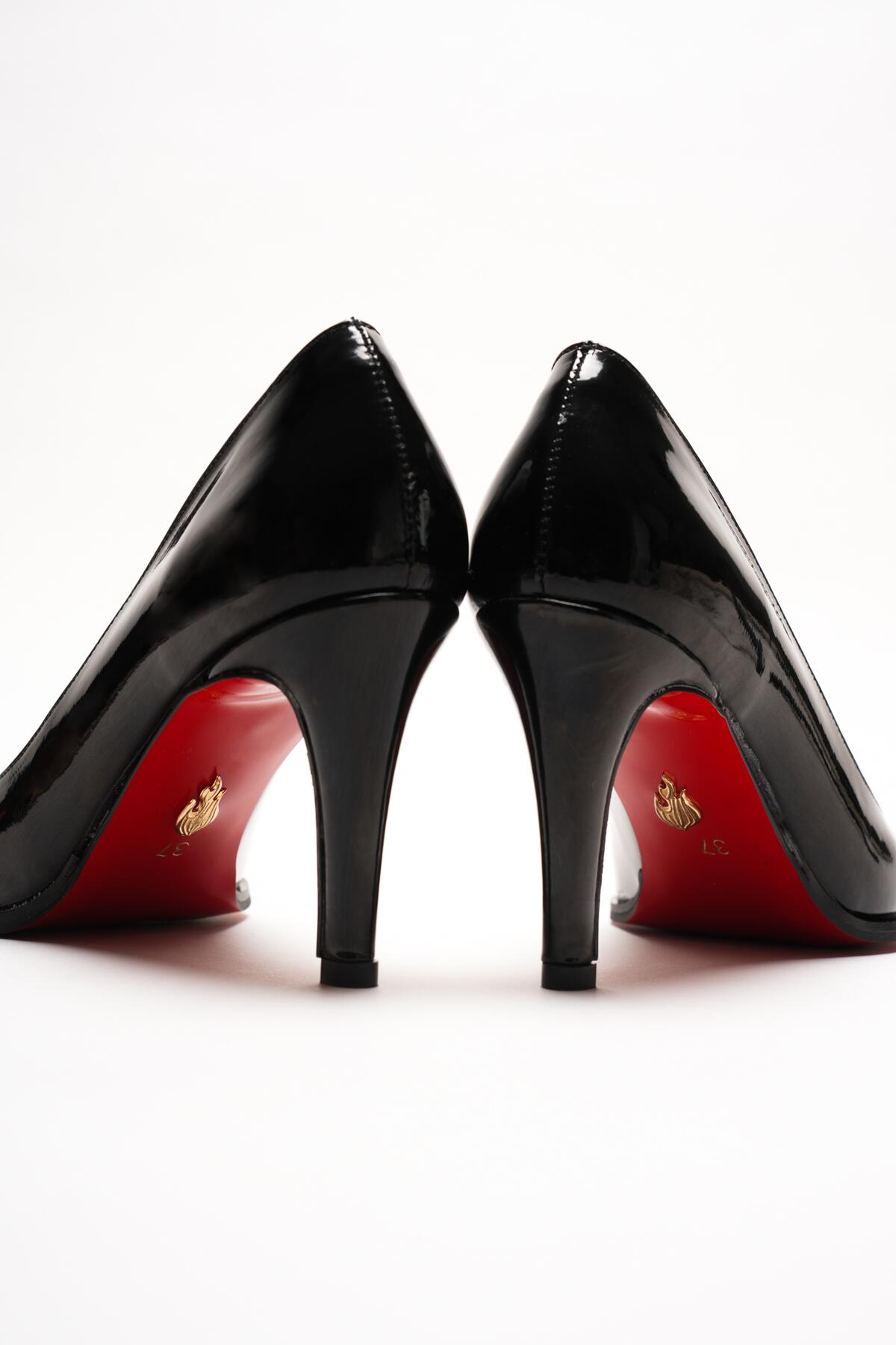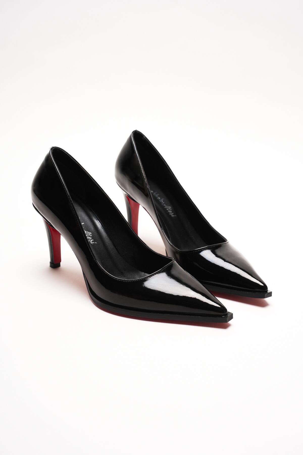 Kadın Sivri Burun Tasarım Taban İnce Kısa Topuklu Ayakkabı Gronia Siyah Rugan
