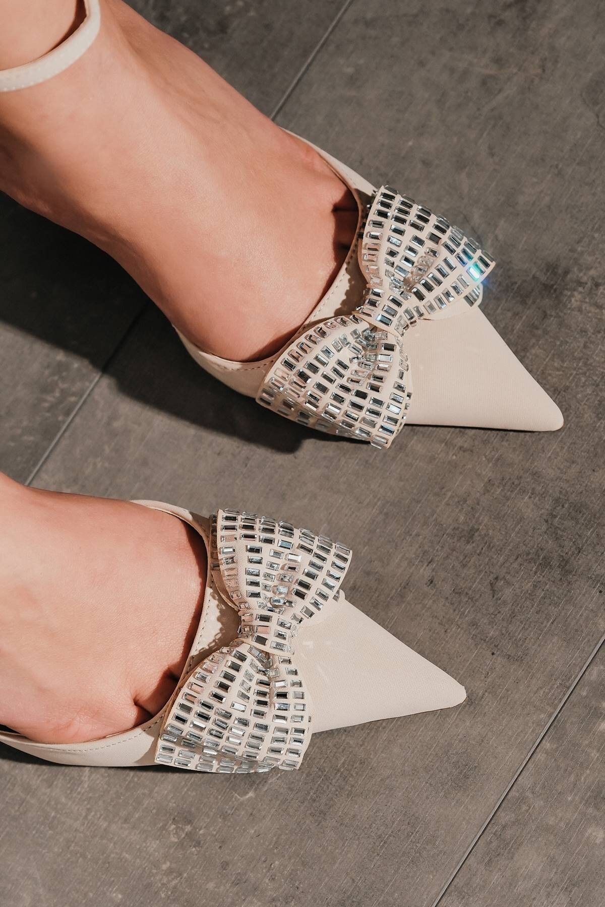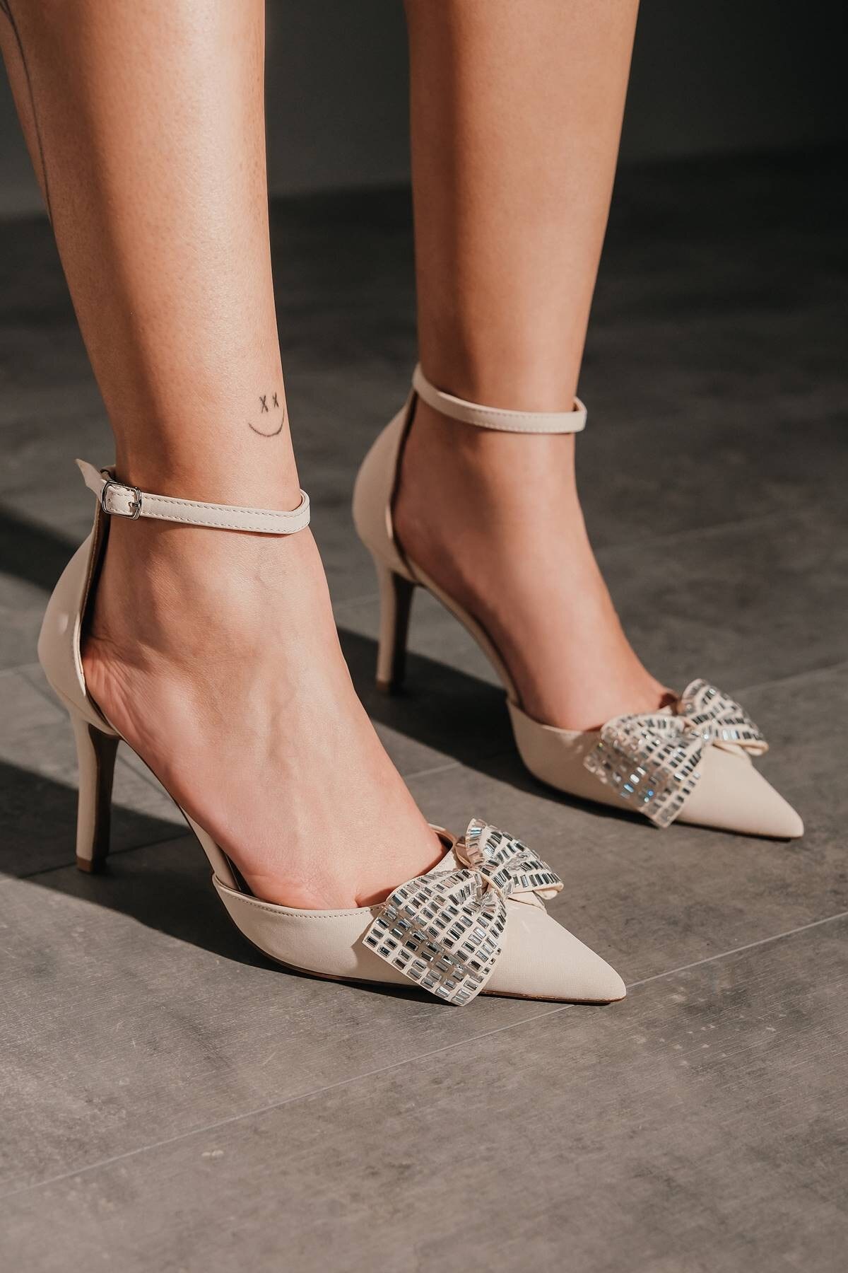 Kadın Taş Papyonlu İnce Topuklu Ayakkabı Poril Bej