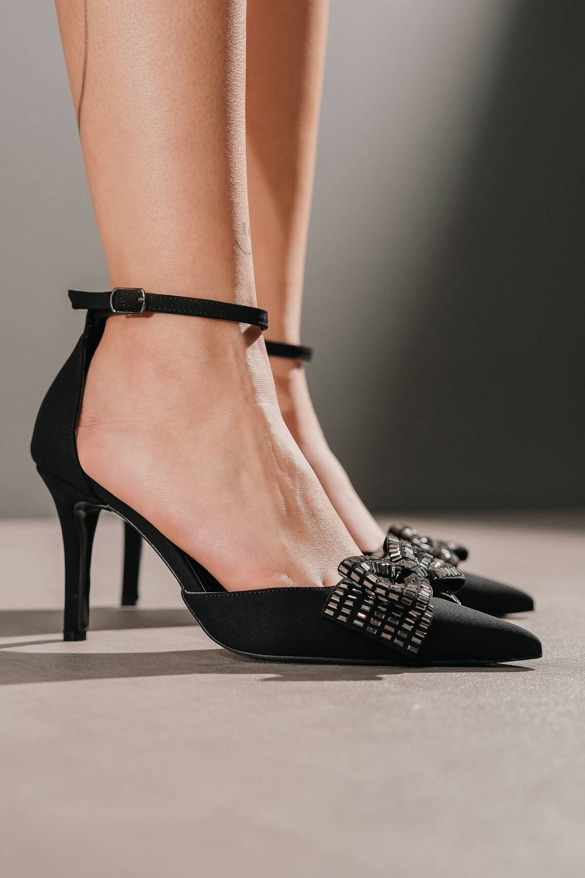 Kadın Taş Papyonlu İnce Topuklu Ayakkabı Poril Siyah Saten