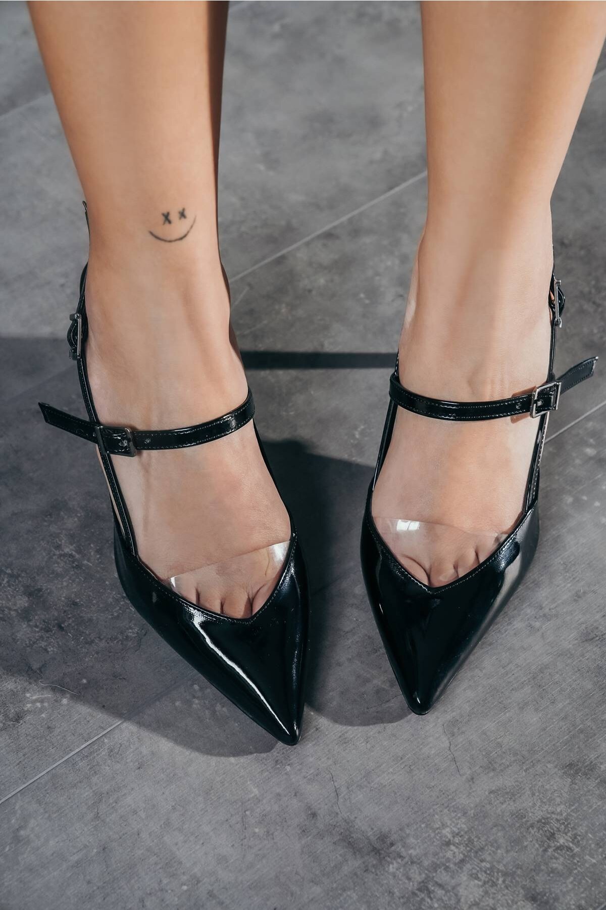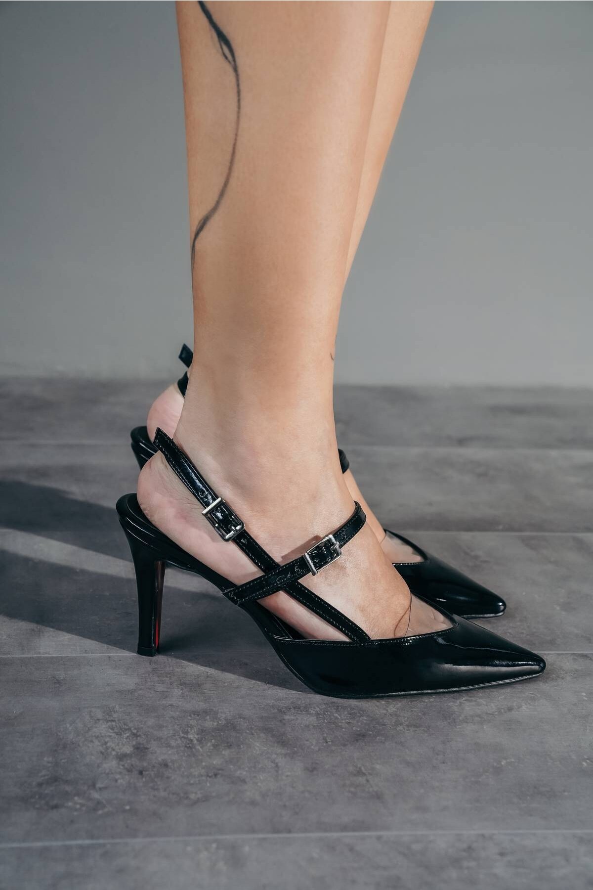 Siyah Rugan Dört Bant Tasarım Topuklu Ayakkabı Zida
