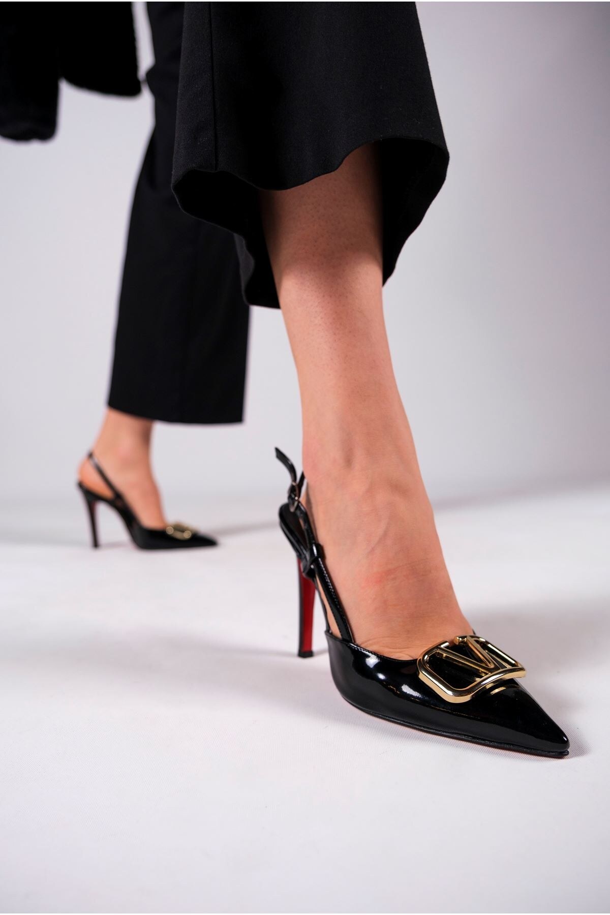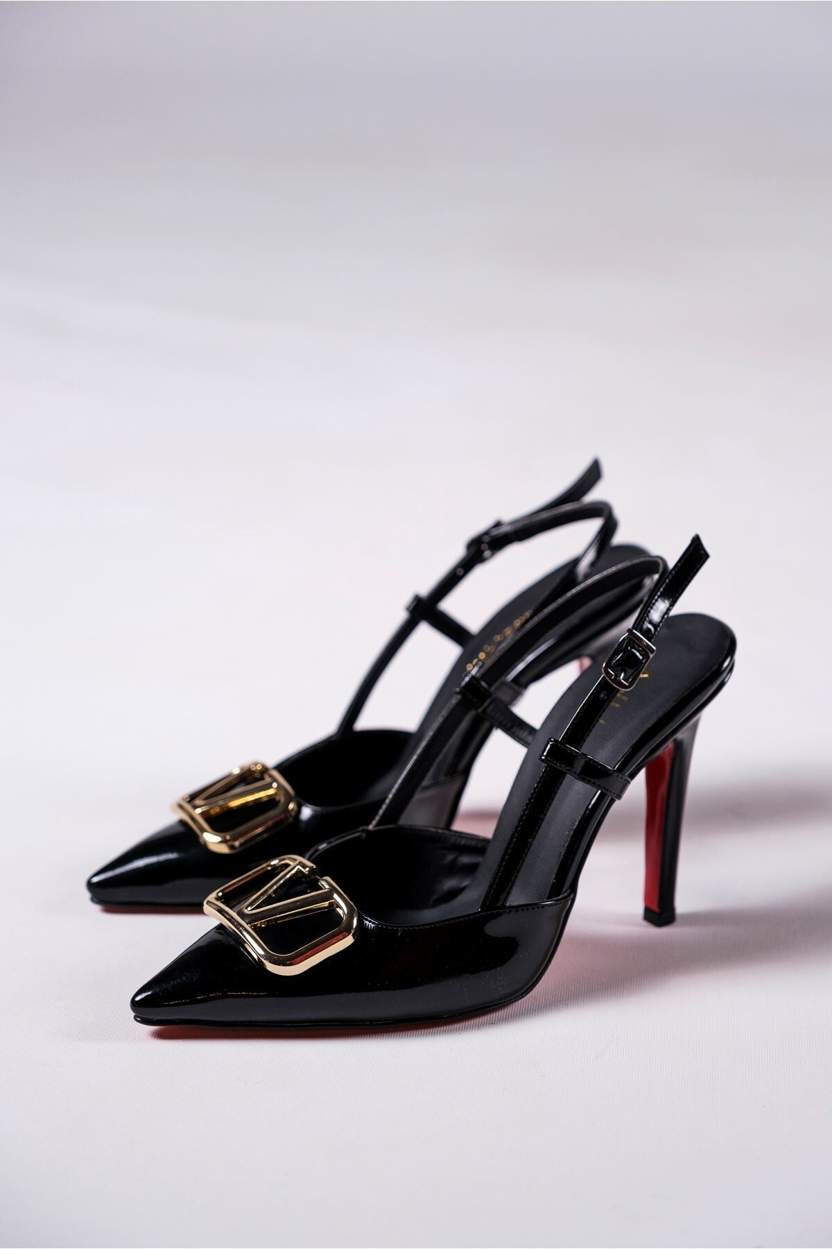 Kadın V Toka Detay İnce Topuklu Ayakkabı Kajino Siyah Rugan