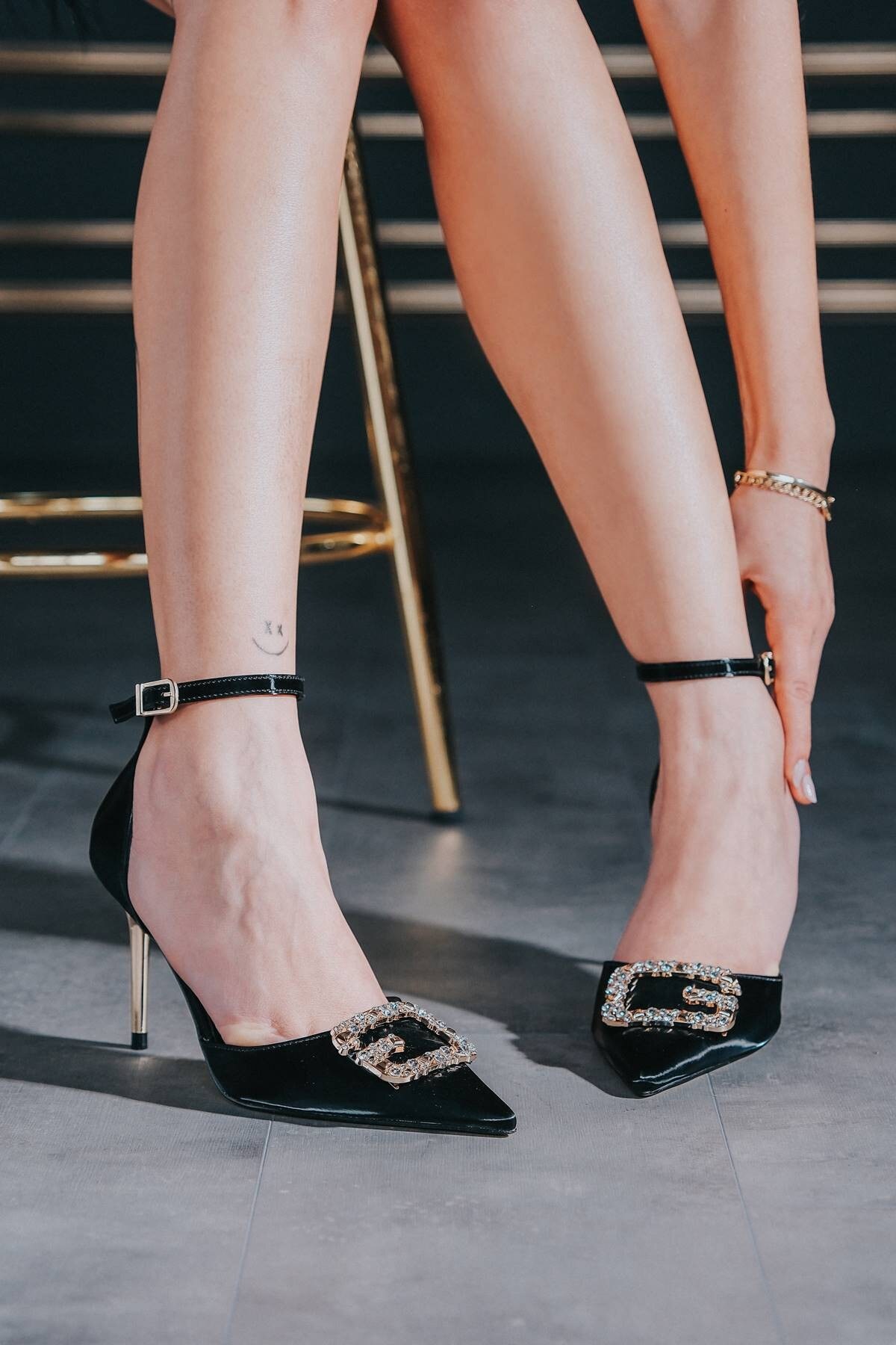 Siyah Saten Özel Tokalı Kadın İnce Topuklu Ayakkabı Corca Siyah Saten