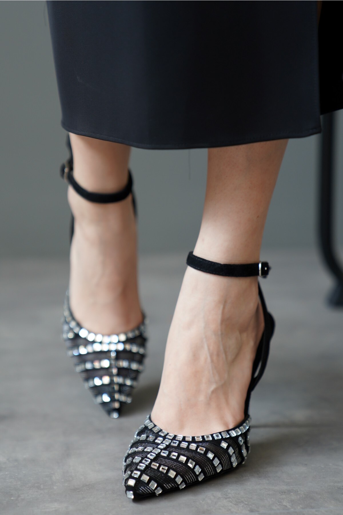 Siyah Süet Taş File Detaylı Kadın İnce Topuklu Ayakkabı İmurca Siyah