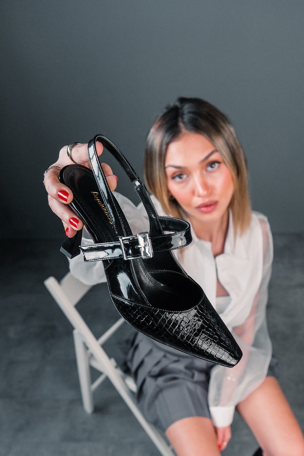 Siyah Tasarım Tokalı Rugan Kadın Topuklu Ayakkabı Lisa Siyah